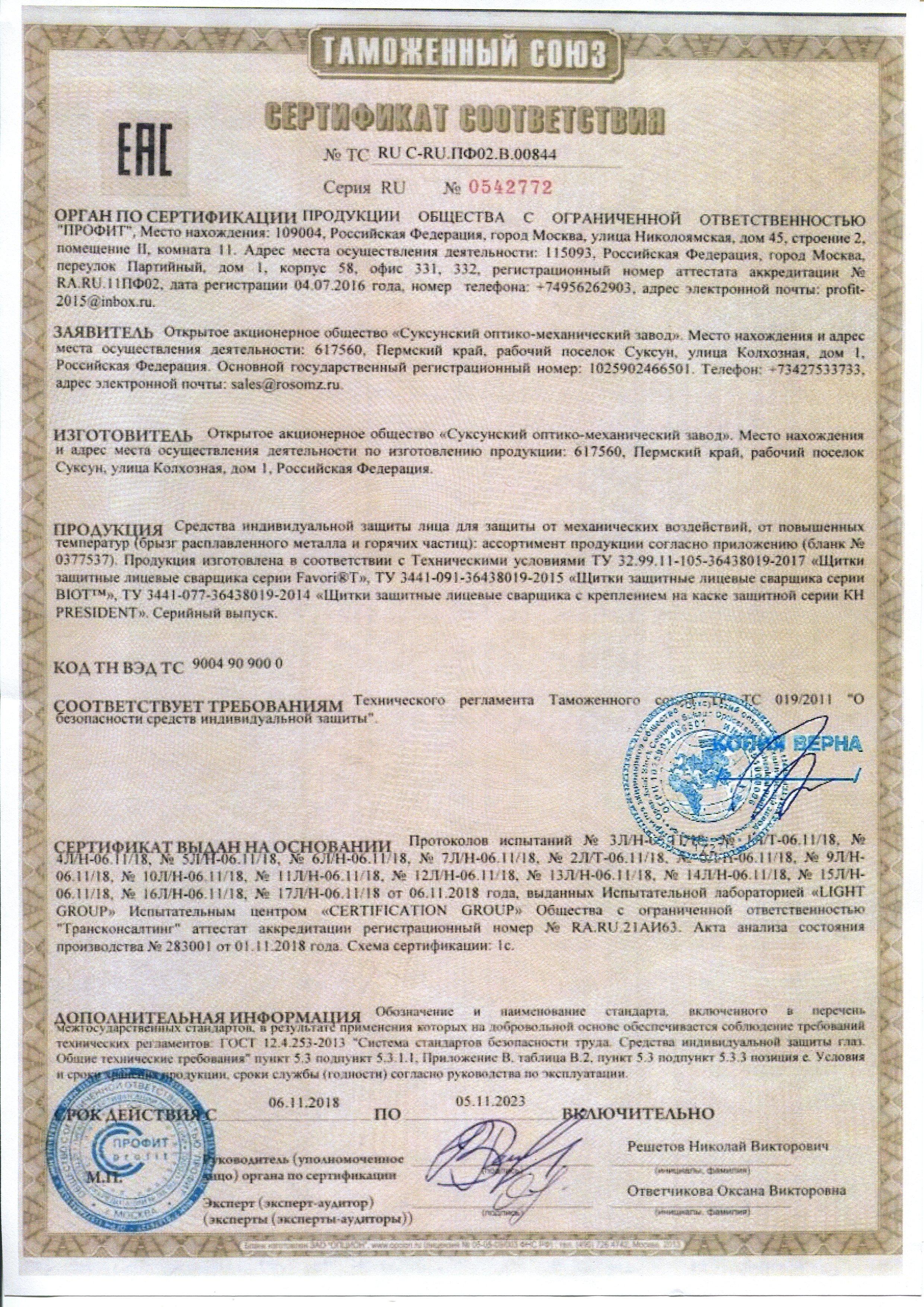 пассивный светофильтр размером 110х90 мм из минерального стекла с градационным шифром от 9 до 14 защищен снаружи поликарбонатным стеклом, с внутренней стороны поликарбонатной подложкой. Оптический класс 1;