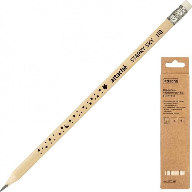 Карандаш чернографитный Attache Starry Sky в деревянном корпусе со «звездным» узором. Эргономичный трехгранный корпус предотвращает соскальзывание пальцев при письме. Простые карандаши с ластиком поставляются заточенными. Твердость грифеля — HB. Длина карандаша — 187 мм. Легко затачиваются. Поставляются в упаковке по 6 штук.