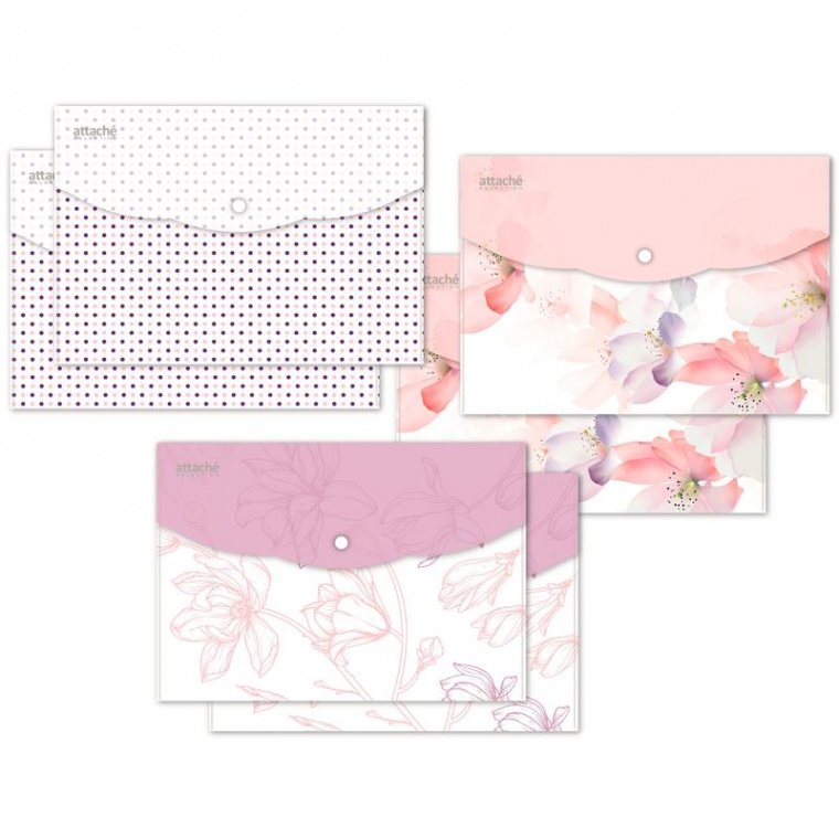 Папка-конверт на кнопке Attache Selection Dreams формата А5. Папка-уголок сделана из экологичного полипропилена. 3 оттенка в ассортименте. Плотность: 180 мкм. В упаковке 6 штук. Папка используется для хранения документов.