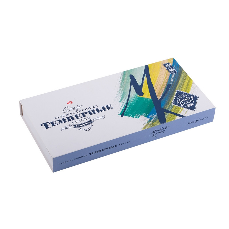 Краски темперные Мастер-Класс изготавливаются на основе высококачественных органических и неорганических пигментов и поливинилацетатной дисперсии и являются традиционным материалом для живописи. Благодаря тщательно отобранным компонентам темперные краски серии 'Мастер-Класс' прекрасно подходят для живописных и декоративно-дизайнерских работ. Они легко наносятся на бумагу, картон, дерево. При высыхании образуют эластичную, непрозрачную, несмываемую пленку. Состав набора: белила титановые, охра светлая, кадмий желтый средний, кадмий красный светлый или кадмий красный темный, железная красная или краплак красный, ультрамарин или кобальт синий, голубая ФЦ, окись хрома или изумрудно-зеленая, умбра жженая или сиена жженая, сажа газовая. Размер упаковки: 29,5х14,2х3,3 см.