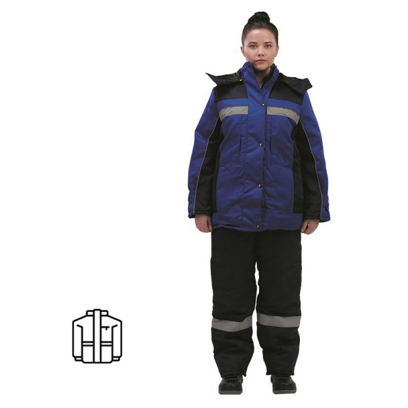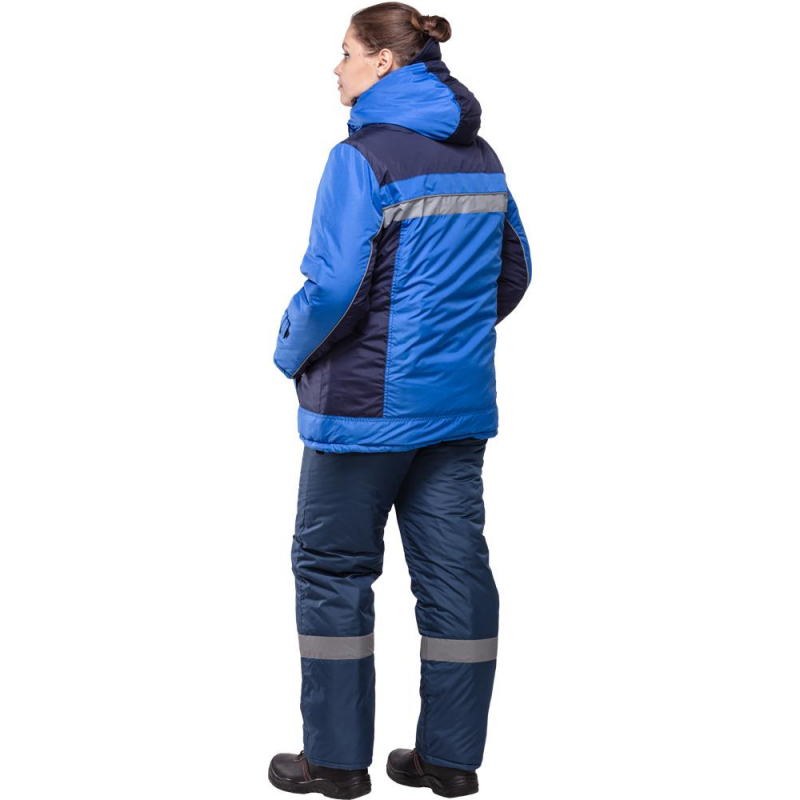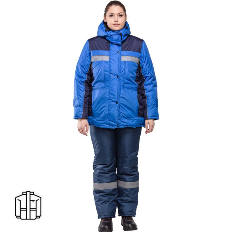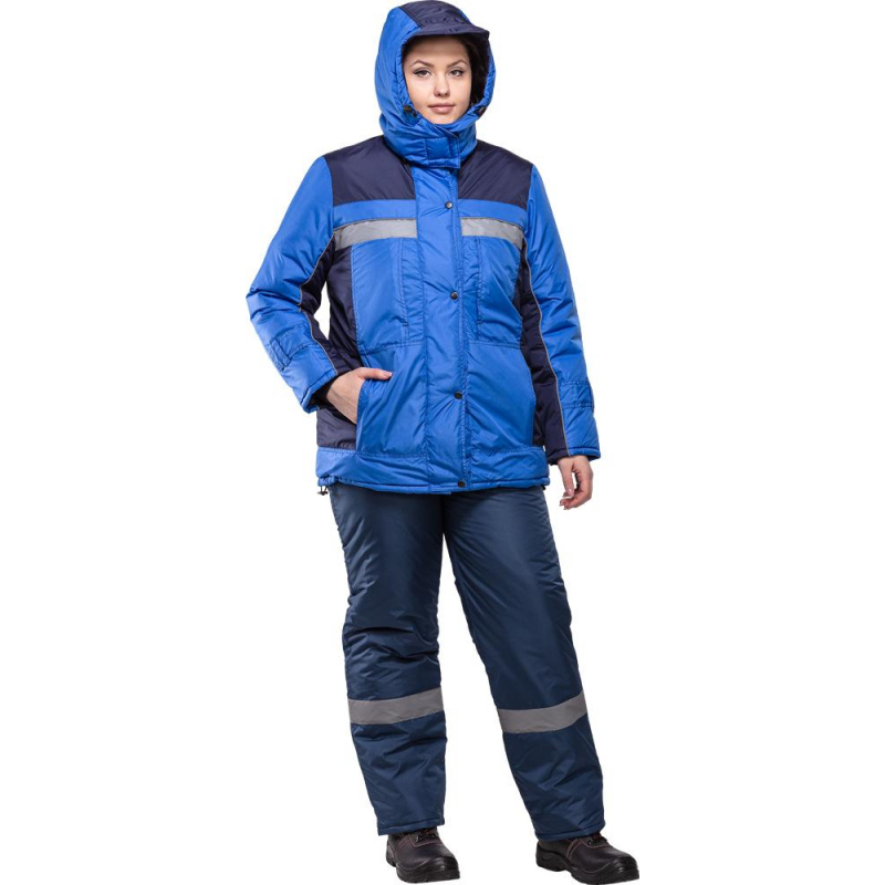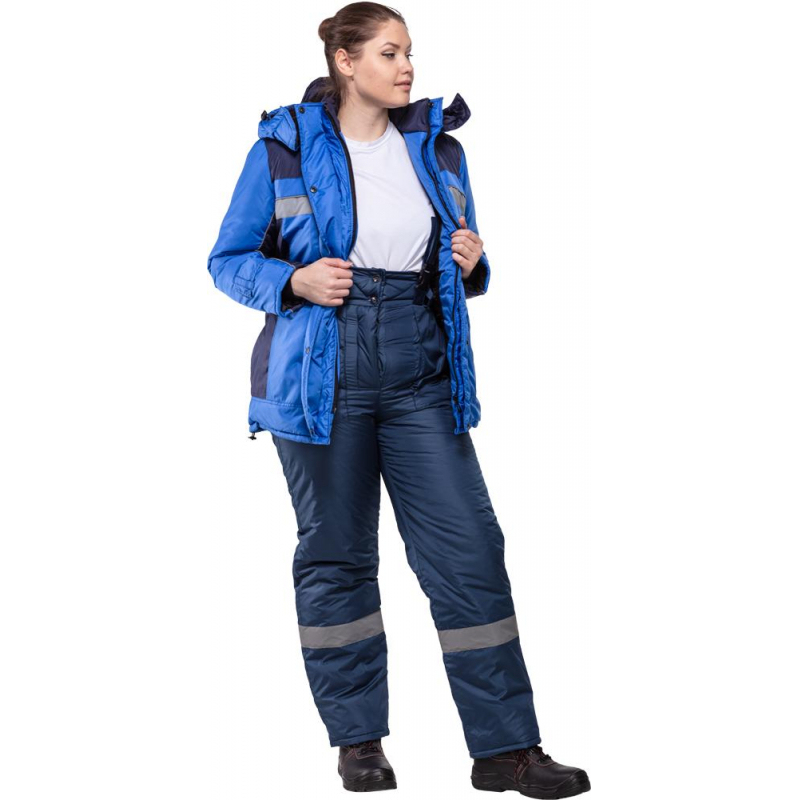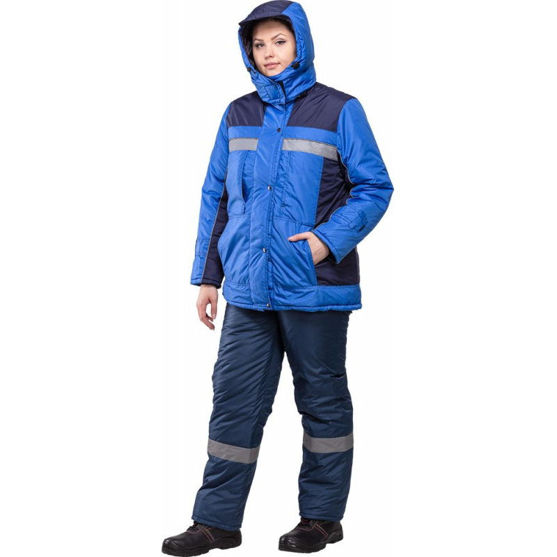 Спецодежда зимняя куртка женская з07-КУ (размер 56-58, рост 158-164) василькового цвета с синими вставками. Изготовлена из ткани 'Дюспо' (100% полиэфир) плотностью 100 г/кв.м. Утеплитель из синтепона плотностью 200 г/кв.м (2 слоя). Зимняя куртка прямого кроя с центральной застежкой на молнию, имеющая светоотражающую полосу, воротник-стойку, отстегивающийся капюшон и внутренний карман. Молния закрывается ветрозащитным клапаном. Низ рукавов оснащен хлястиками, которые держатся на контактной ленте. Нижнюю часть куртки можно отрегулировать эластичной тесьмой с фиксаторами. Куртка обеспечивает защиту от пониженных температур и производственных загрязнений. Рекомендована для использования в сельском хозяйстве, логистике, легкой промышленности, строительстве. ГОСТ 12. 4. 303-2016. Коллекция зимней спецодежды з07 выпускается из нескольких видов ткани: смесовая и дюспо. К курткам з07-КУ дюспо подходят брюки з07-БР дюспо. Также вместо брюк можно подобрать полукомбинезон з07-ПК дюспо.