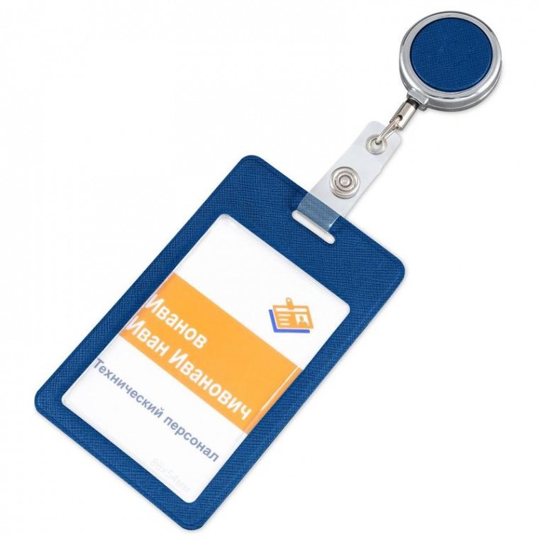 Бейдж вертикальный, изготовлен из пластика. Размер бейджа — 104×63 мм. Цвет изделия — синий. Крепление изделия осуществляется при помощи рулетки. Прекрасно подходит для пропуска или визитной карточки. Страна производства: Россия.