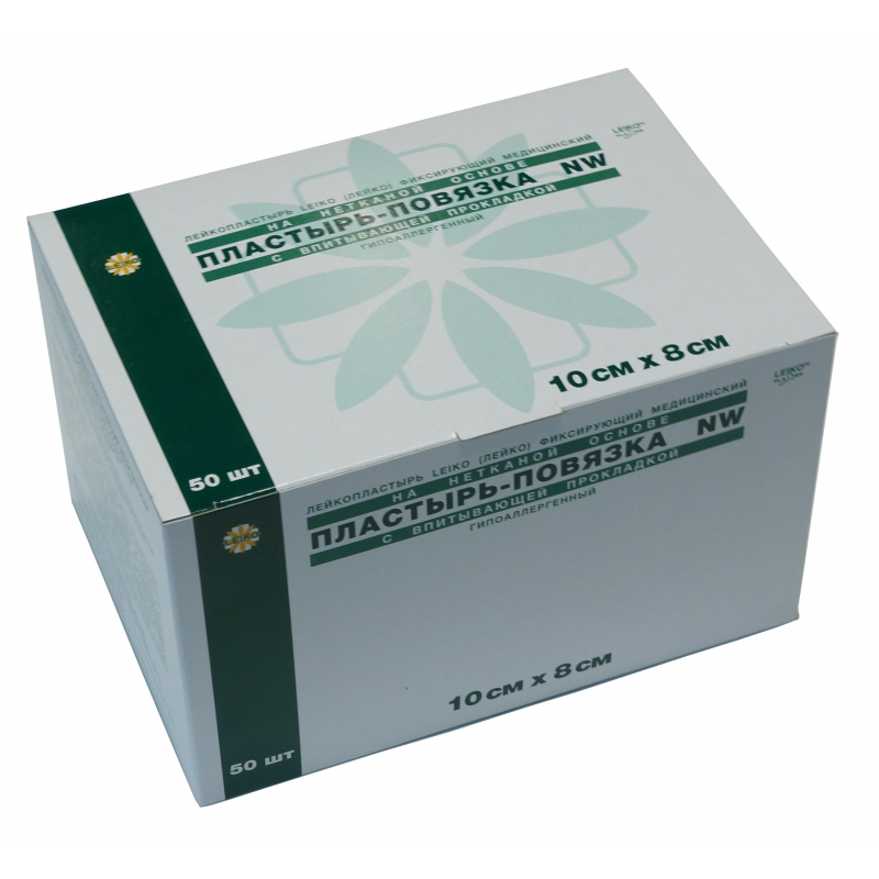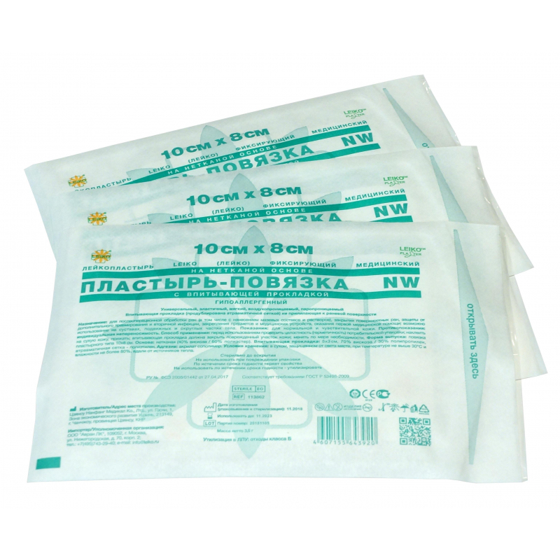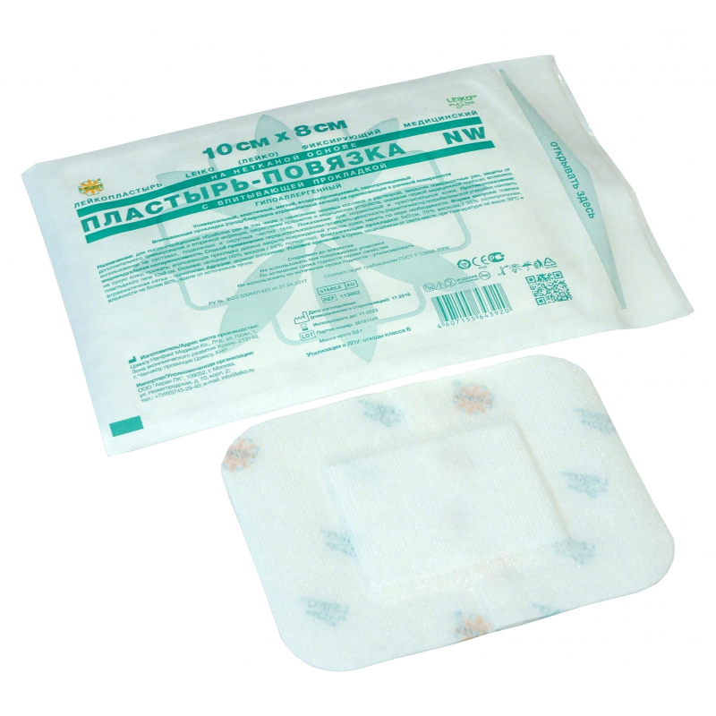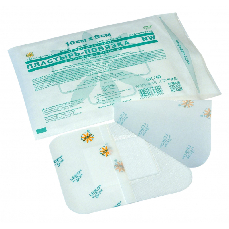 Лейкопластырь Leiko фиксирующий медицинский на нетканой основе, пластырь-повязка NW, с впитывающей прокладкой, гипоаллергенный 10х8 см. Универсальный, эластичный, мягкий, воздухопроницаемый, паропроницаемый. Впитывающая прокладка (продублирована атравматической сеткой) не прилипающая к раневой поверхности. Назначение: для послеоперационной обработки ран (в том числе с нанесением мазевых составов и растворов), закрытия поверхностных ран, защиты от дополнительного травмирования и вторичной инфекции, закрепления предметов и медицинских устройств, оказания первой медицинской помощи; возможно использование на суставах, подвижных и округлых частях тела. Показания: для нормальной и чувствительной кожи. Противопоказания: индивидуальная непереносимость. Способ применения: перед использованием проверить целостность (герметичность) потребительской упаковки; наклеить на сухую кожу, прижать; впитывающая прокладка должна закрыть поврежденный участок кожи; менять по мере необходимости. Условия хранения: в сухом, защищенном от света месте, при температуре не выше 30 °С и влажности не более 80%, вдали от источников тепла. Стерильно до вскрытия. Не использовать при повреждении упаковки. По истечении срока годности теряет свойства. Не использовать по истечении срока годности - утилизировать.