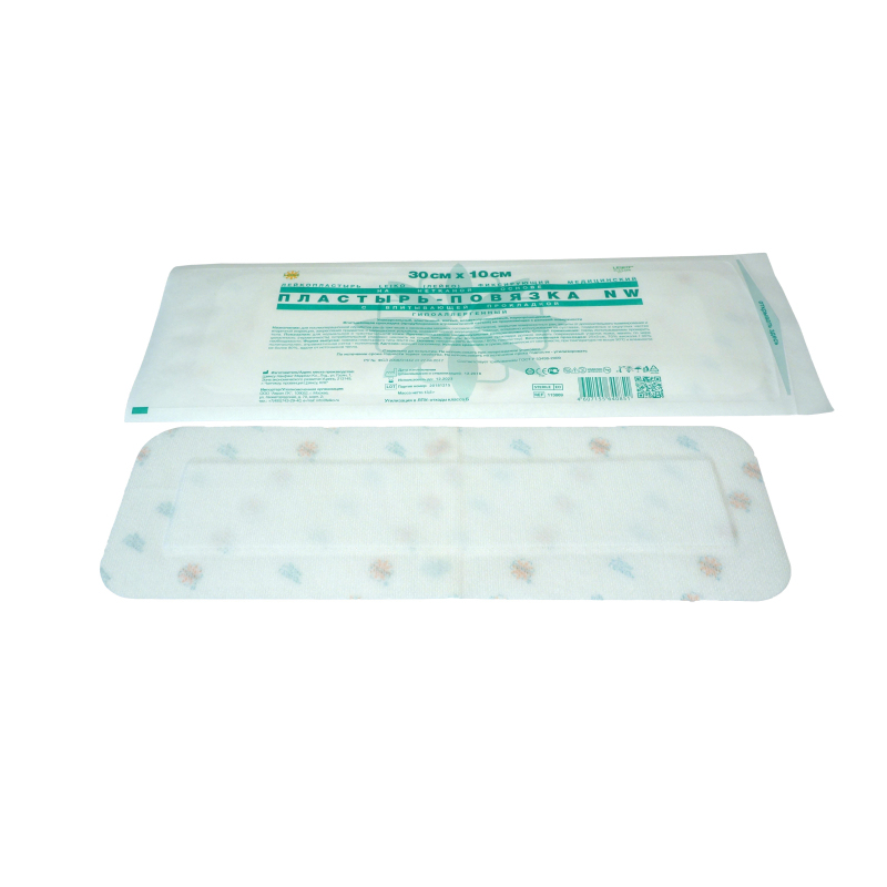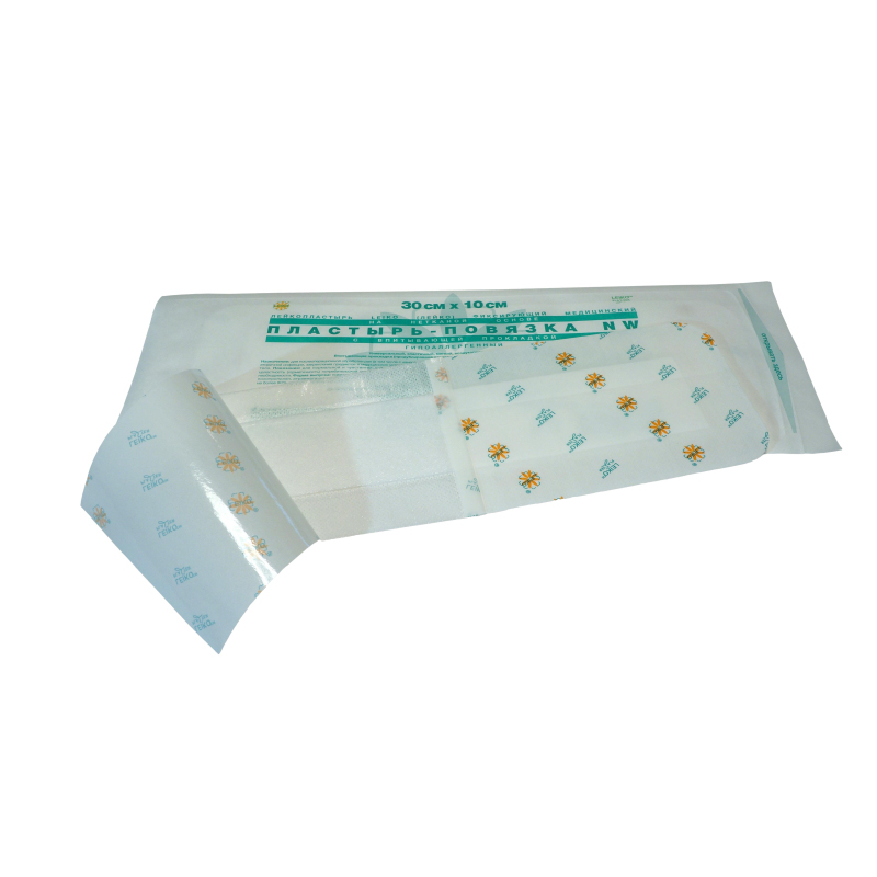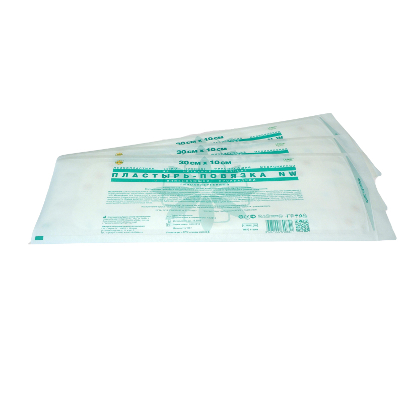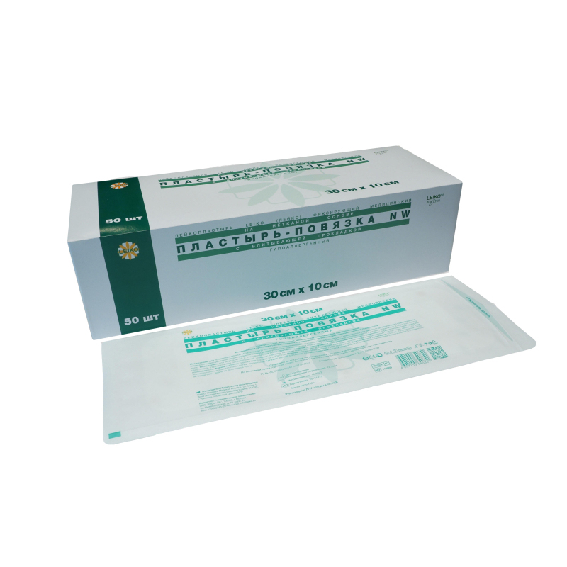 Лейкопластырь LEIKO (ЛЕЙКО) фиксирующий медицинский на нетканой основе, пластырь-повязка NW, с впитывающей прокладкой, гипоаллергенный 30 см х 10 см. Универсальный, эластичный, мягкий, воздухопроницаемый, паропроницаемый. Впитывающая прокладка (продублирована атравматической сеткой) не прилипающая к раневой поверхности. Назначение: для послеоперационной обработки ран (в том числе с нанесением мазевых составов и растворов), закрытия поверхностных ран, защиты от дополнительного травмирования и вторичной инфекции, закрепления предметов и медицинских устройств, оказания первой медицинской помощи; возможно использование на суставах, подвижных и округлых частях тела. Показания: для нормальной и чувствительной кожи. Противопоказания: индивидуальная непереносимость. Способ применения: перед использованием проверить целостность (герметичность) потребительской упаковки; наклеить на сухую кожу, прижать; впитывающая прокладка должна закрыть поврежденный участок кожи; менять по мере необходимости. Условия хранения: в сухом, защищенном от света месте, при температуре не выше 30°С и влажности не более 80%, вдали от источников тепла. Стерильно до вскрытия. Не использовать при повреждении упаковки. По истечении срока годности теряет свойства. Не использовать по истечении срока годности - утилизировать.