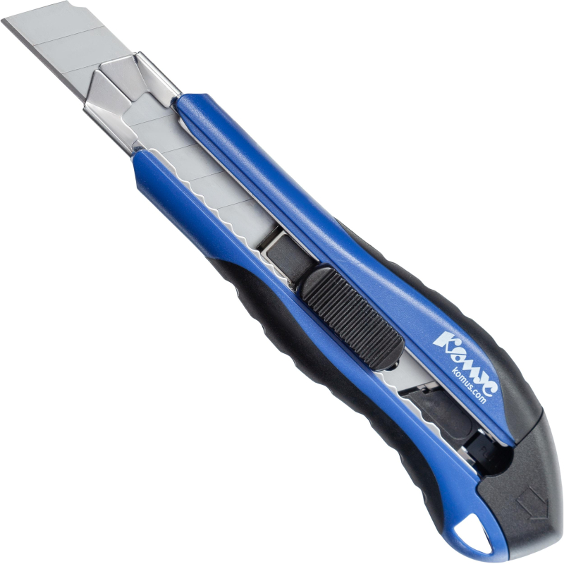 Нож канцелярский Комус с сегментированным отламывающимся лезвием. Подходит для резки бумаги, ткани, картона, пленки, ленты стрейч, кожи, складских работ, а также для проведения ремонтных работ, не требующих приложения больших усилий. Нож оснащен эргономичной рукояткой с прорезиненными противоскользящими вставками контрастного цвета. Металлическая направляющая из нержавеющей стали обеспечивает надежную фиксацию лезвия в момент использования. На рукоятке предусмотрено отверстие для удобства хранения и переноски. Особенности изделия: - Корпус выполнен из экономичного пластика - Сменные сегментированные лезвия из стали - Автоматическая блокировка лезвия (Auto-Lock) - Запасные лезвия в комплекте 5 шт. Характеристики изделия: - Длина ножа 174,0 мм - Ширина лезвия 18,0 мм - Толщина лезвия 0,5 мм - Количество рабочих сегментов 8 шт. Схема замены лезвия: 1.Снять с корпуса торцевую заглушку 2.Извлечь из корпуса каретку 3.Снять со шпинделя отработанное лезвие, установить новое 4.Вставить каретку в направляющую и вернуть на место торцевую заглушку Меры предосторожности: - При работе с лезвиями используйте средства защиты - Не утилизируйте лезвия с бытовыми отходами - Хранить в недоступном для детей месте