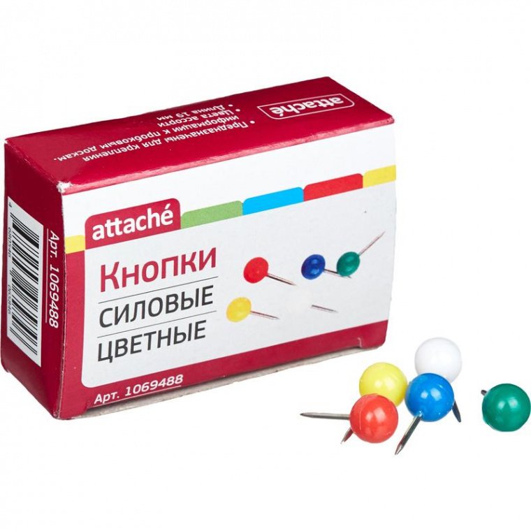 Кнопки силовые Attache предназначены для крепления информации на текстильных и пробковых досках. Шляпки в форме шариков выполнены из пластика, а основания в виде иголок — из прочного металла. Длина кнопки с шариком — 19 мм, длина иглы без шарика — 11 мм. В упаковке содержится 50 кнопок с разноцветными шляпками (зеленый, белый, желтый, красный, синий). В коробке 24 упаковки.