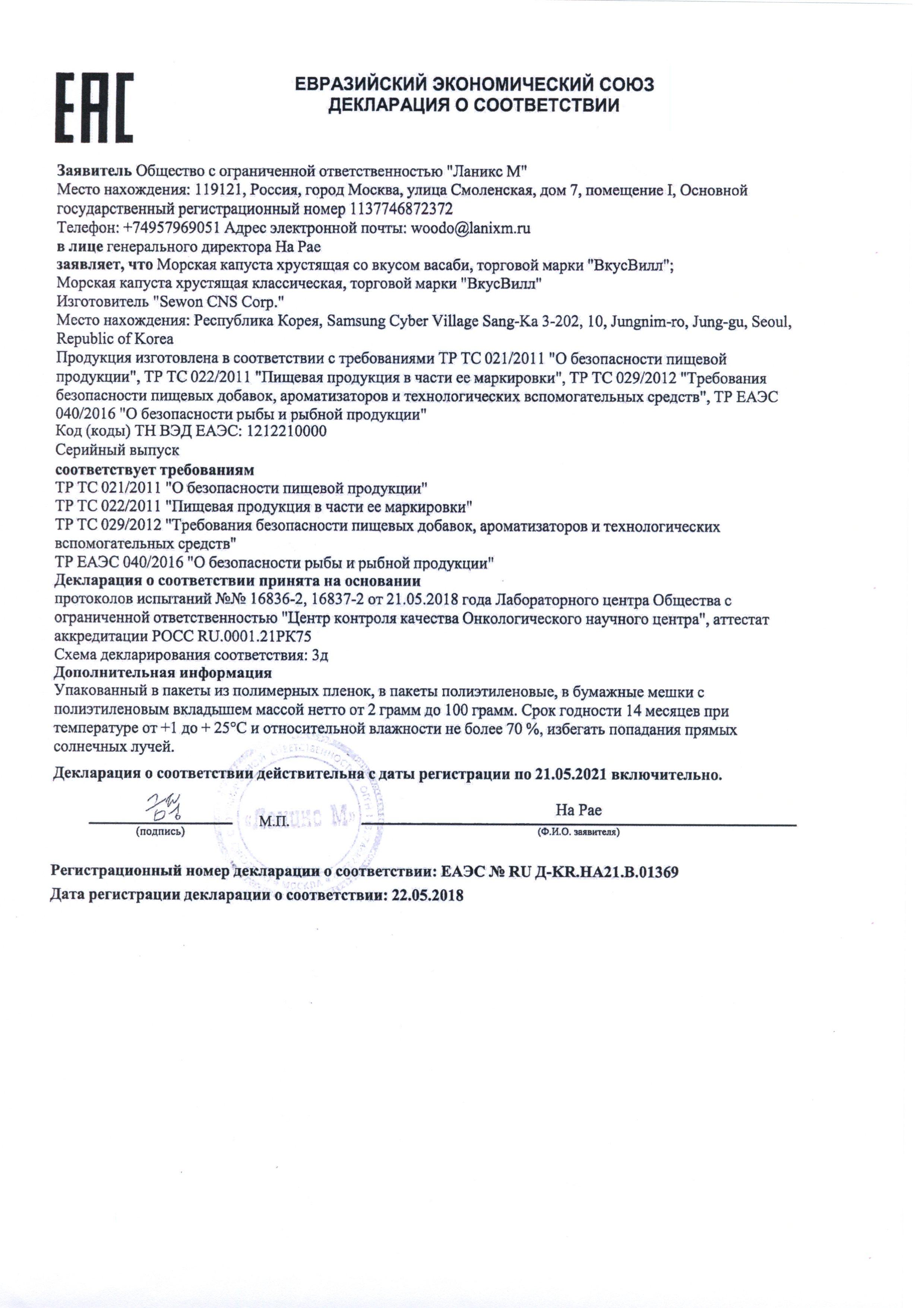 Отличное предложение для ценителей полезных продуктов и японской кухни — хрустящая морская капуста со вкусом васаби. Натуральная ламинария, которая выросла в глубинах морей с чистой экологией, приготовлена на смеси растительных масел. Она высушена так, чтобы стать тонкой хрусткой пластинкой. Продукт хорош для перекусов и как пикантная добавка к оригинальным салатам,