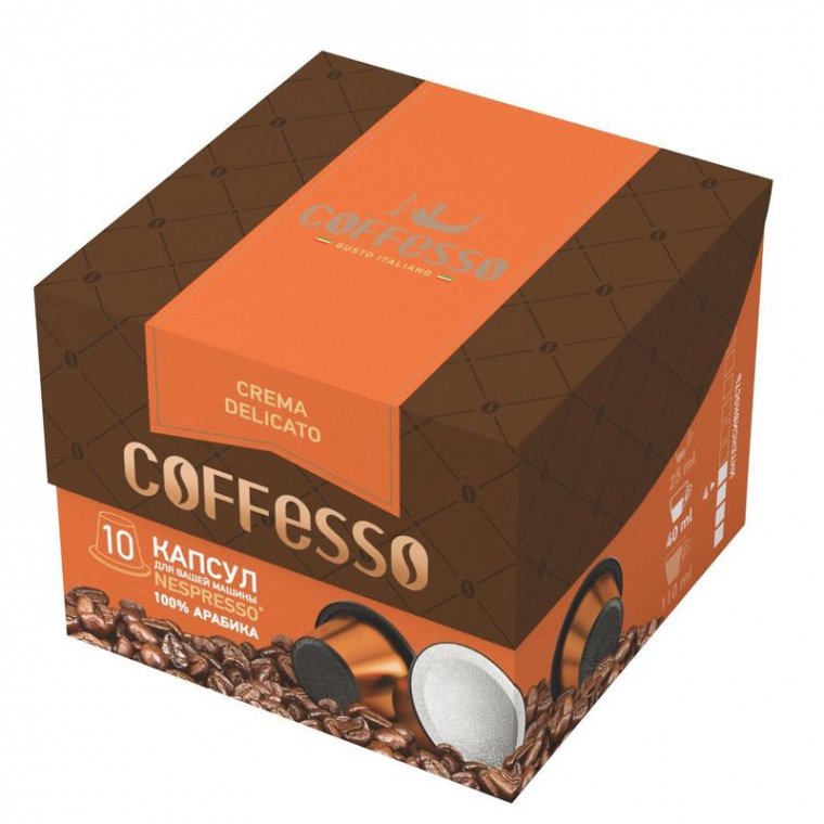 Капсулы для кофемашин Coffesso Crema Delicato 10 штук в упаковке. Кофе в капсулах для кофе-машин Nespresso. Мягкий вкус итальянского кофе, светлая обжарка, деликатная крепость, привелекательный дизайн, экологичная упаковка.