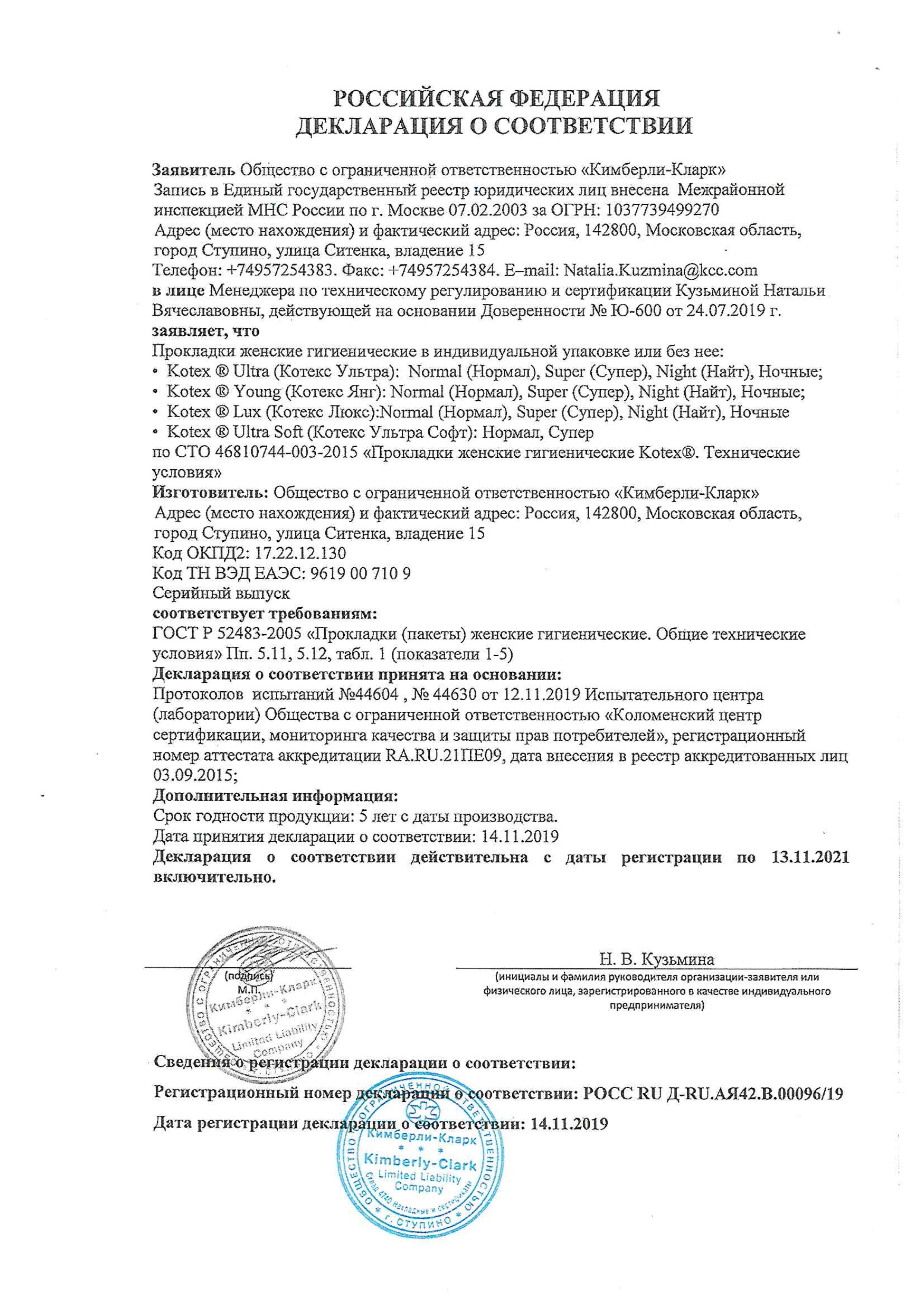 Сертификат на товар - Прокладки женские гигиенические Kotex Ultra Normal (40 штук в упаковке)