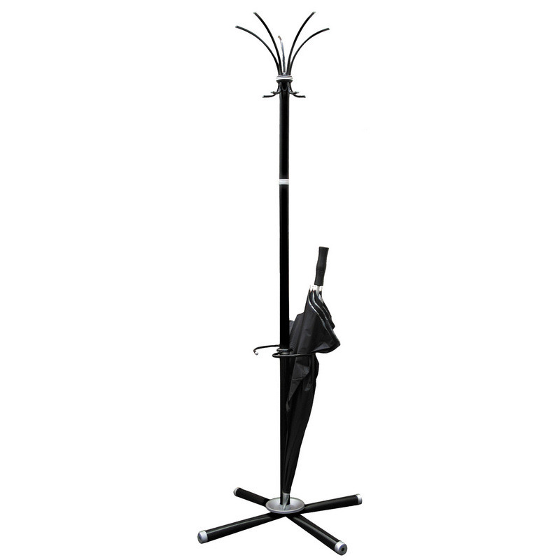 Напольная вешалка высотой 188 см выполнена из металла с покрытием черного цвета. Размер крестовидного основания - 64x64 см. Не занимает много места, подходит для дома и офиса. В верхней части штанги-стойки расположены крючки и рожки для пяти предметов одежды и головных уборов. Также имеется держатель для зонтов-тростей. Нагрузка на верхний крючок для головных уборов - 1 кг. Нагрузка на нижний крючок для одежды - 5 кг. Максимальная распределенная нагрузка на вешалку - 30 кг;Изображения товаров на сайте не могут гарантировать точную цветопередачу.