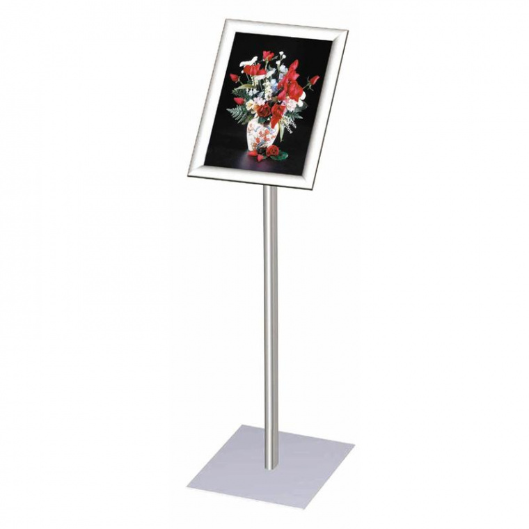 Разборный информационный напольный стенд предназначен для хранения печатной продукции формата А4 в вертикальном положении и под углом 45 градусов. Основание — окрашенная металлическая пластина размером 28×28 см и толщиной 5 мм, стойка — алюминиевый анодированный профиль, постер вставляется в алюминиевую рамку с защелкивающимся профилем шириной 30 мм. Устойчивая конструкция размещается автономно без крепления к стенам и полу. Крепежные элементы для сборки и инструкция по сборке входят в комплект. Цвет серебристый. Вес стенда составляет 6,8 кг. Размеры рамки — 25×33 см, высота стойки — 100 см.
