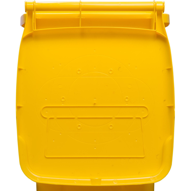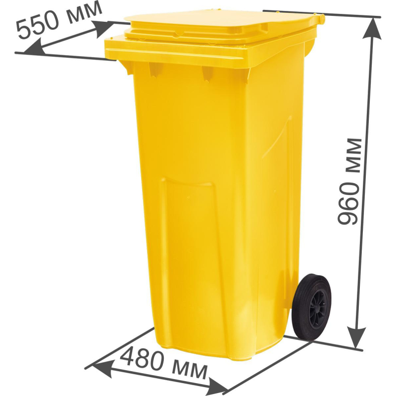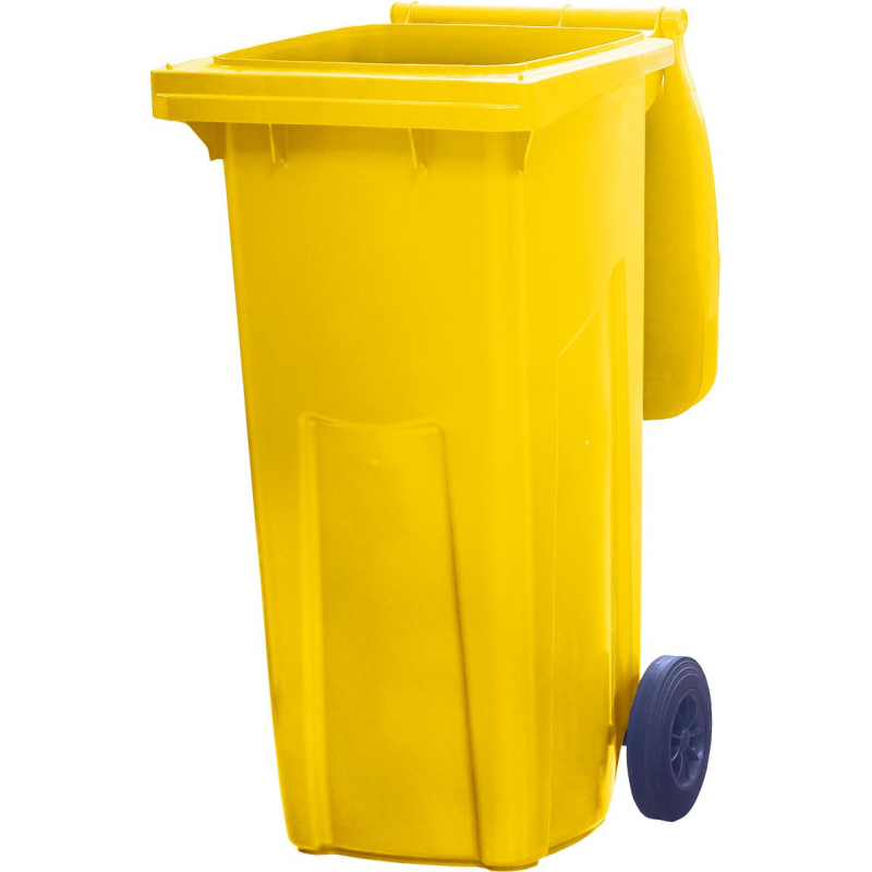 Контейнер-бак мусорный 120 л пластиковый на 2-х колесах с крышкой желтый Передвижной мусорный контейнер (240 литров с крышкой) обладает значительным объемом для хранения бытовых и промышленных отходов. Два больших прорезиненных колеса диаметром 200 мм обеспечивают мобильность изделия, а прочный пластик гарантирует длительный период использования и значительную нагрузку. Контейнер оснащен герметичной крышкой, что исключает распространение запахов. Подходит для раздельного сбора мусора. Контейнер оснащен усиленной передней гребенкой для работы с мусоровывозящей техникой. Грузоподъемность 120 кг. Есть ручки. Материал: полиэтилен высокой плотности низкого давления (HDPE). Используемый материал характеризуется: легкостью, высокой прочностью, устойчивостью к выцветанию, к воздействию агрессивных химических веществ, к перепадам температур; возможно использование при низких и высоких температурах (от -40 до 60 °С). Высота контейнера-бака: 96 см (с крышкой), 94 см (без крышки) Размер по верхней кромке: 55x48 см Размер дна: 25x34 см Размер крышки: 44x44 см Диаметр колес: 200 мм Цвет: желтый Вес: 7,3 кг Внимание! Поставляется в разобранном виде.