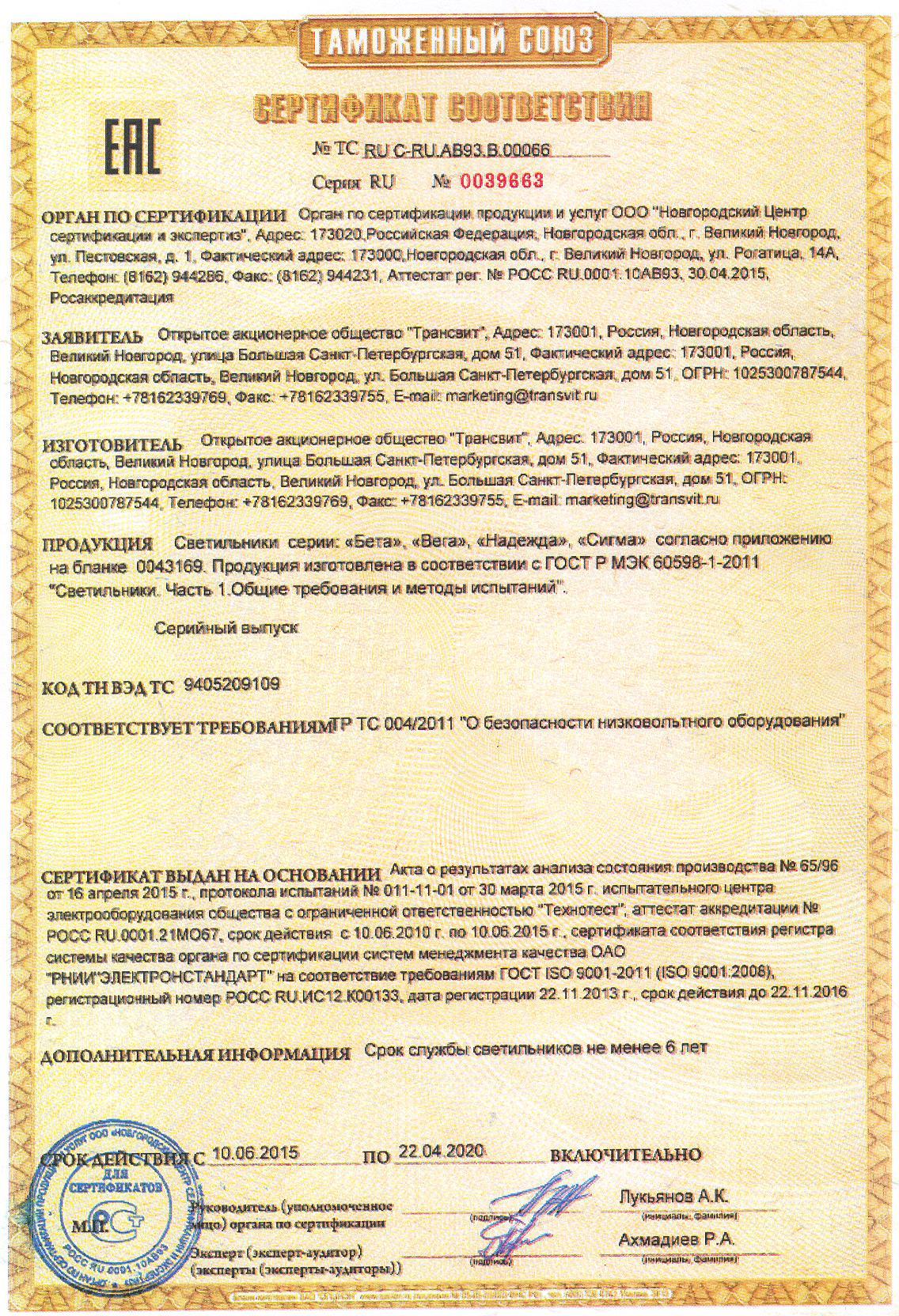Сертификат на товар - Светильник настольный Трансвит Бета-Ш черный