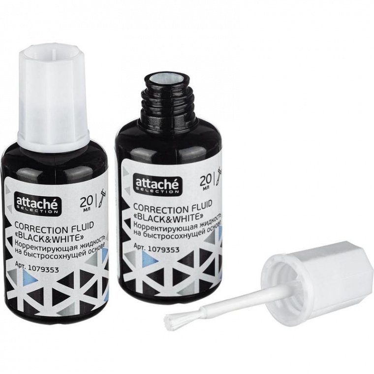 Корректирующая жидкость Attache Selection Black&White применяется для корректировки всех типов документов, включая бумагу для факсов. Ложится ровным гладким слоем, создает непрозрачное покрытие. Имеет быстросохнущую основу. Вид кисточки — ворс. Объем флакона с корректирующей жидкостью составляет 20 мл. 1. Перед применением тщательно встряхните средство в течение не менее 10 секунд, затем снимите колпачок. 2. Равномерно нанесите средство на бумагу. 3. После применения плотно закройте колпачок.