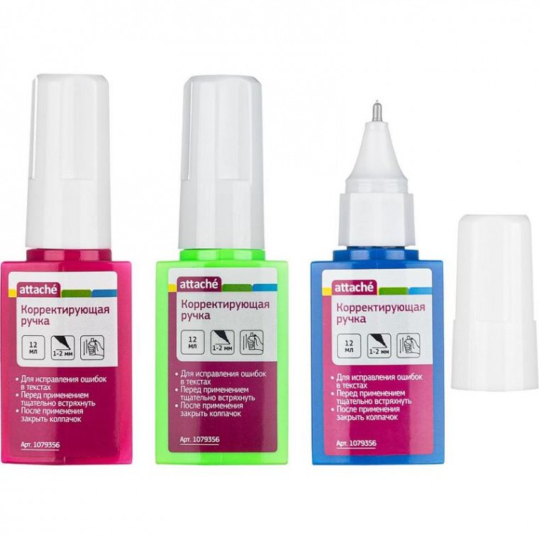 Корректирующая ручка Attache предназначена для точечных исправлений на любых типах бумаги. Объем флакона — 12 мл. Пластиковый наконечник позволяет наносить тонкие линии. Содержит быстросохнущую основу, обладает высокой кроющей способностью. Внимание! Товар поставляется в нескольких вариантах цвета корпуса (без возможности выбора). 1. Перед применением тщательно встряхните средство в течение не менее 10 секунд, затем снимите колпачок. 2. Прижмите наконечник ручки к поверхности бумаги. 3. Нажмите на корпус ручки для подачи корректирующего средства и равномерно нанесите его на бумагу. 4. После применения плотно закройте колпачок.