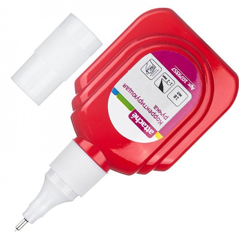 Корректирующая ручка Attache предназначена для точечных исправлений на любых типах бумаги. Объем флакона — 18 мл. Металлический наконечник позволяет наносить тонкие линии. Содержит быстросохнущую основу, обладает высокой кроющей способностью. 1. Перед применением тщательно встряхните средство в течение не менее 10 секунд, затем снимите колпачок. 2. Прижмите наконечник ручки к поверхности бумаги. 3. Нажмите на корпус ручки для подачи корректирующего средства и равномерно нанесите его на бумагу. 4. После применения плотно закройте колпачок.