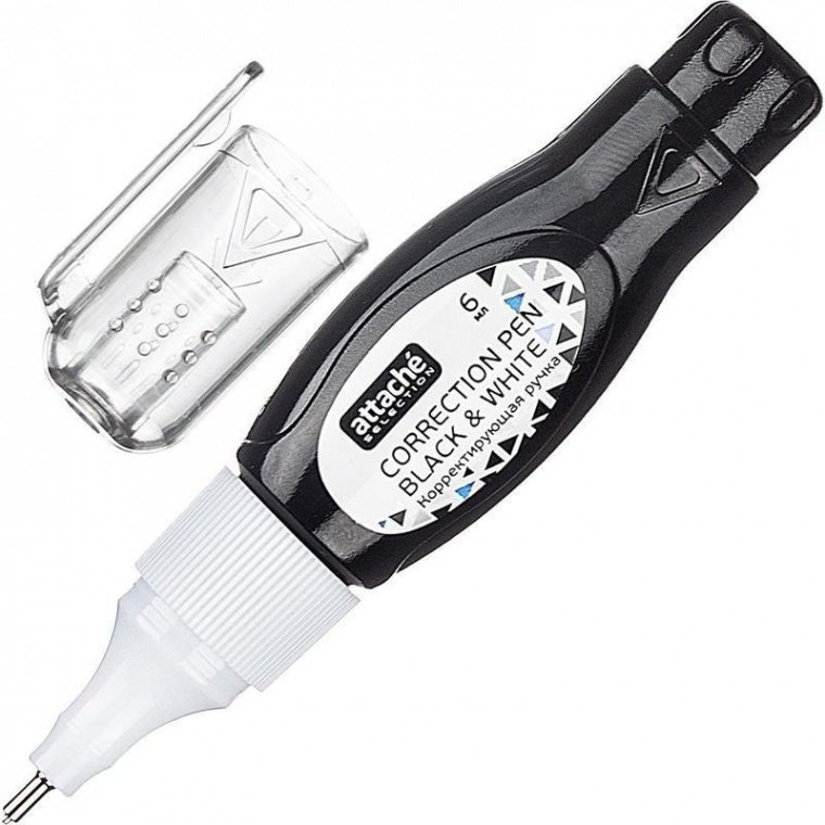 Корректирующая ручка Attache Selection Black&White предназначена для точечных исправлений на любых типах бумаги. Объем флакона — 6 мл. Металлический наконечник позволяет наносить тонкие линии. Содержит быстросохнущую основу, обладает высокой кроющей способностью. 1. Перед применением тщательно встряхните средство в течение не менее 10 секунд, затем снимите колпачок. 2. Прижмите наконечник ручки к поверхности бумаги. 3. Нажмите на корпус ручки для подачи корректирующего средства и равномерно нанесите его на бумагу. 4. После применения плотно закройте колпачок.