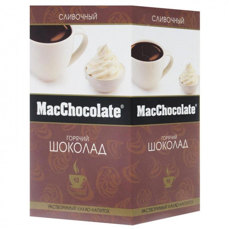 MacChocolate — это растворимый напиток, приготовленный по особому рецепту из лучших сортов какао с добавлением сливок и сахара.