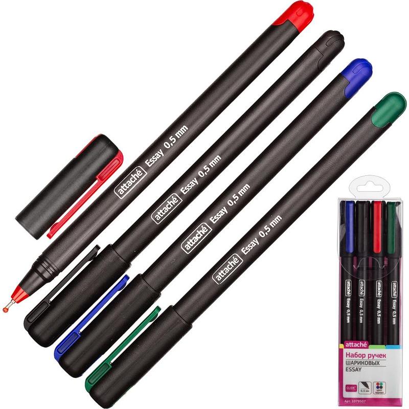 Набор шариковых ручек Attache Essay 4 цвета - набор ярких и насыщенных цветов на каждый день для работы в офисе и учебы. Модель выполнена в пластиковом черном корпусе круглой формы с элегантными деталями и клипом в цвет чернил. Ручки оснащены вентилируемым колпачком и клипом в цвет чернил. Одноразовый стержень, снабжен игольчатым наконечником диаметром 0,7 мм, который обеспечивает тонкую линию письма 0,5 мм. Длина стержня - 128 мм. Ручка, созданная по революционным технологиям с использованием материалов высшего качества, обеспечивает мягкое и качественное письмо за счет использования чернил низкой вязкости на масляной основе. Чернила устойчивы к выгоранию и размытию водой, не замерзают при низкой температуре (до 18 градусов). За счет особого расположения шарика пишущего узла ручка идеально подходит для письма как правой, так и левой рукой. Сочетание уникальных технологий производства чернил и пишущего узла позволяет писать на 20% дольше без пропусков и помарок при минимальном давлении на ручку. В данной ручке великолепно сочетаются инновационный дизайн и высокое качество письма без помарок. В наборе 4 ручки (синяя, черная, красная, зеленая).