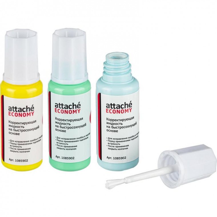 Корректирующая жидкость Attache Economy применяется для корректировки всех типов документов, включая бумагу для факсов. Ложится ровным гладким слоем, создает непрозрачное покрытие. Имеет быстросохнущую основу. Во флаконе есть металлический шарик (перед использованием рекомендуется встряхивать). Вид кисточки — ворс. Объем флакона с корректирующей жидкостью составляет 12 г. Внимание! Товар поставляется в нескольких вариантах цвета корпуса (без возможности выбора). 1. Перед применением тщательно встряхните средство в течение не менее 10 секунд, затем снимите колпачок. 2. Равномерно нанесите средство на бумагу. 3. После применения плотно закройте колпачок.