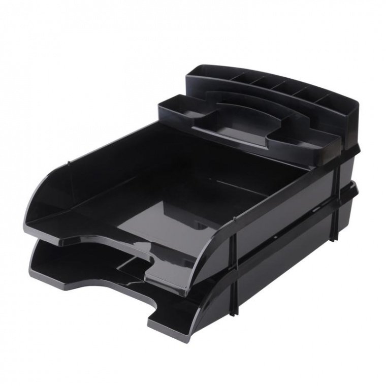 Набор Attache состоит из двух горизонтальных лотков для бумаг формата А4 и подставки канцелярской размером 250×100×62 мм на 10 отделений. Позволяет рационально использовать рабочее место. Подставка канцелярская может устанавливаться на лотки или размещаться отдельно от них на рабочем месте. Изготовлен из полистирола. Цвет: черный. Размеры изделия (ДxШxВ): 330×240×183 мм.