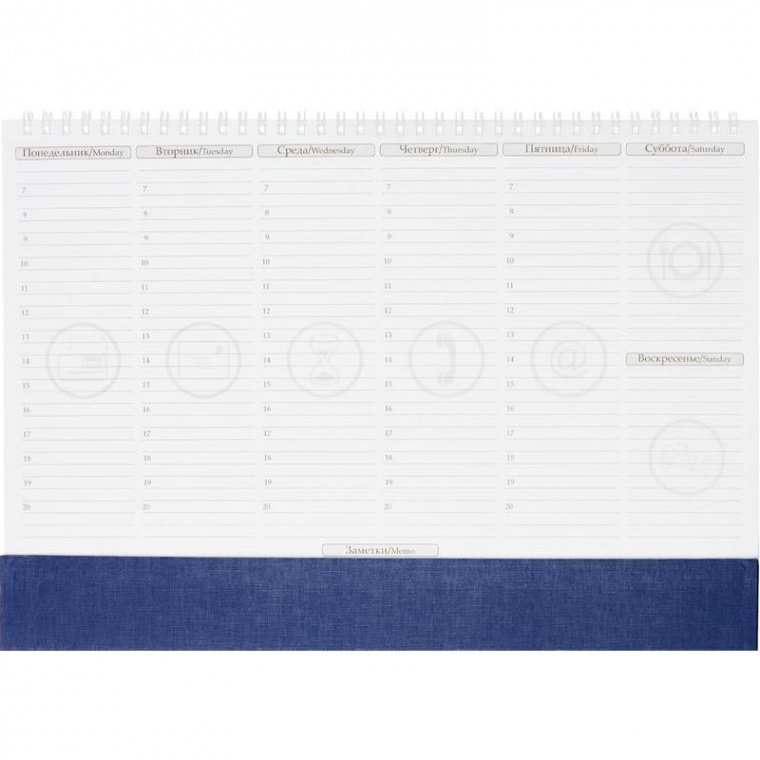 Планинг недатированный Attache коллекции Каньон, размер 490×350 мм без обложки, тип крепления — спираль. С прижимным клапаном из бумвинила (синий)ширина 6.5 см, 54 листа, блок — офсет плотностью 70 г/кв.м., печать в два цвета, подложка — картон толщиной 1,5 мм. Нет календаря и информационной страницы. Информационный блок не содержит Карту Мира и Карту РФ. Есть возможность нанесения логотипа. Поставляется в защитной упаковке.