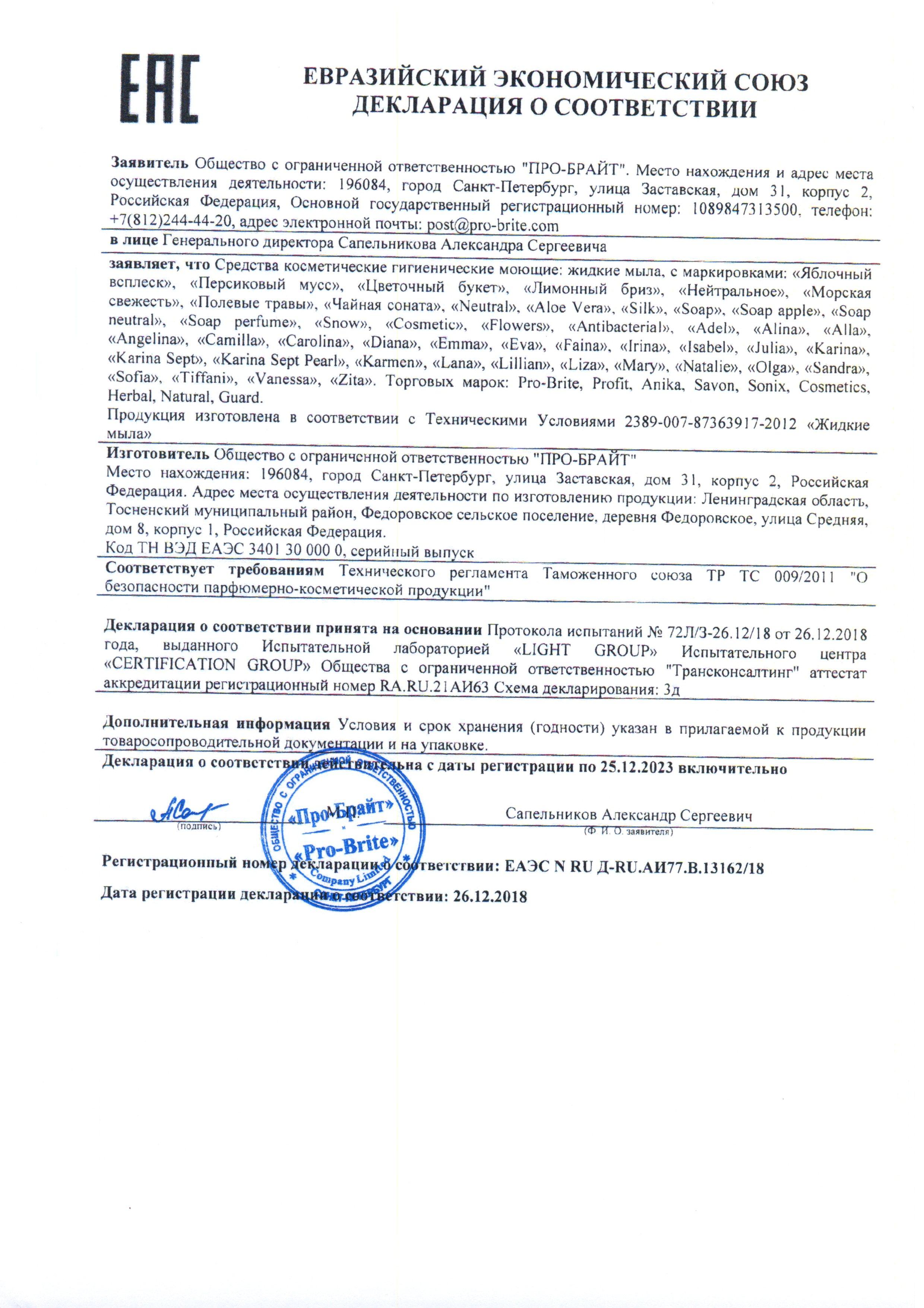 Вода более 30%; аПАВ более 5%, но менее 15%; соль неорганическая менее 5%; амф. ПАВ менее 5%; нПАВ менее 5%; консервант менее 5%.