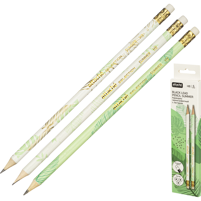 Карандаш чернографитный Attache Selection Summer HB заточенный с ластиком (корпус в ассортименте, 6 штук в упаковке)