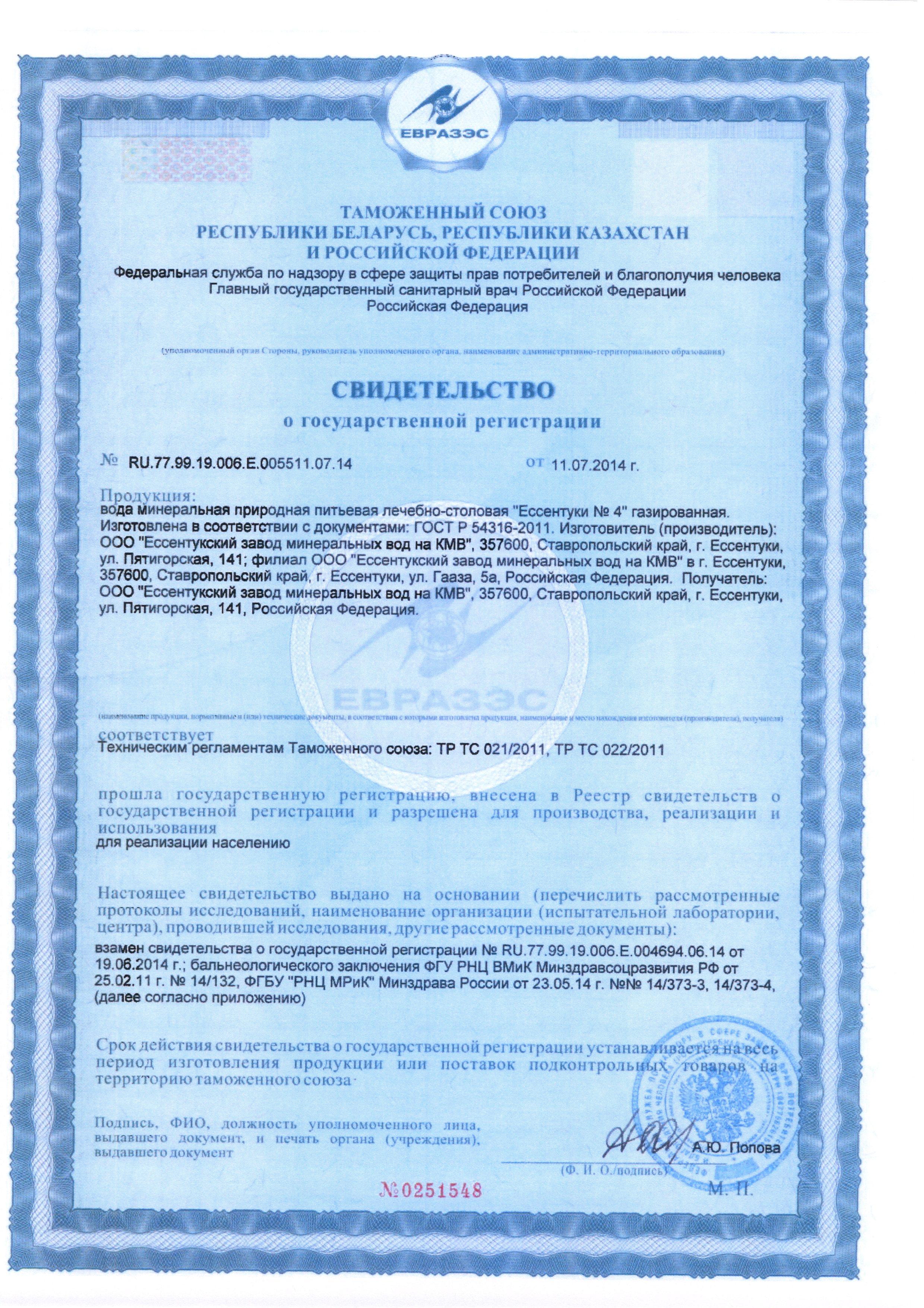 Сертификат на товар - Вода минеральная Ессентуки №4 газированная 0.45 л (20 штук в упаковке)