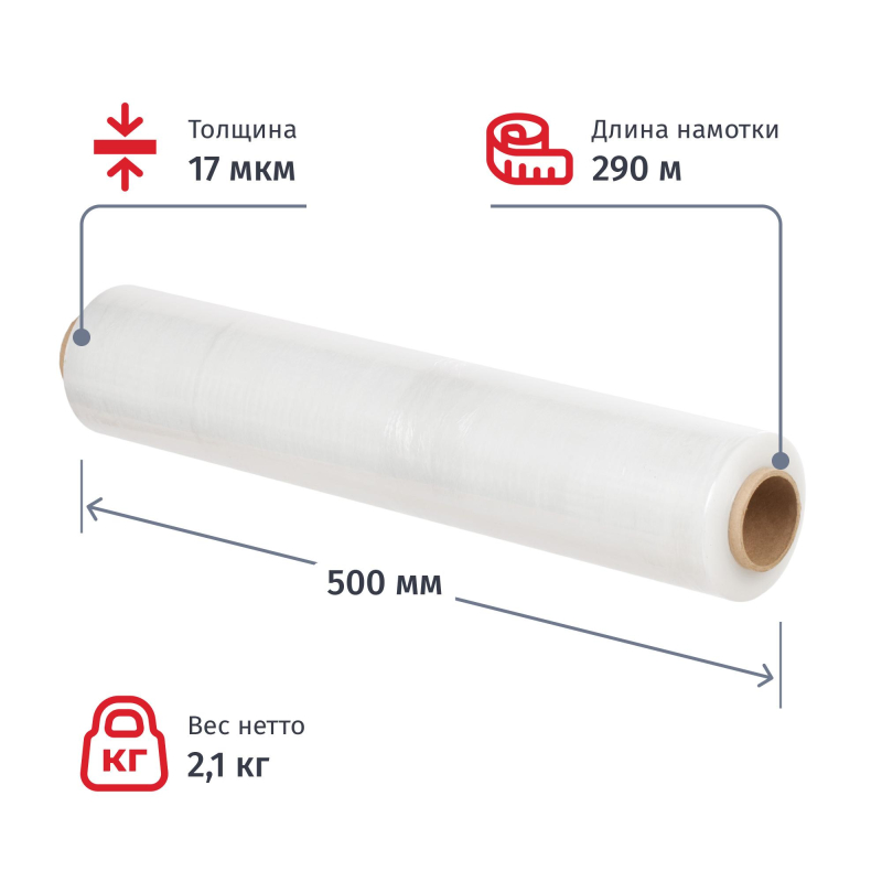 Стрейч-пленка для ручной упаковки вес 2.1 кг 17 мкм x 50 см x 290 м (престрейч 180%, 6 штук в упаковке). Стрейч-пленка 17 мкм применяется для работы с тяжелыми равномерными грузами до 300 кг. Подходит для упаковки грузов и обмотки коробок, для предохранения от внешних воздействий. Изготовлена из прочного полиэтилена, устойчива к разрывам и проколам.Продукция соответствует ТУ производителя. Длина - 290 м, ширина - 50 см, плотность - 17 мкм, вес - 2.1 кг, престрейч (растяжение) 180%. Удобно использовать вместе с диспенсером (устройством для обмотки) арт. 170814 и арт. 571499. Рулоны пленки хранят в вертикальном положении в крытых складских помещениях, при температуре от +5 до +30°С. Перед использованием стретч пленку необходимо выдержать при температуре выше +18°С не менее 24 часов. Возможны незначительные отклонения оттенка стрейч-пленки из-за клеевого компонента в зависимости от партии и производителя.
