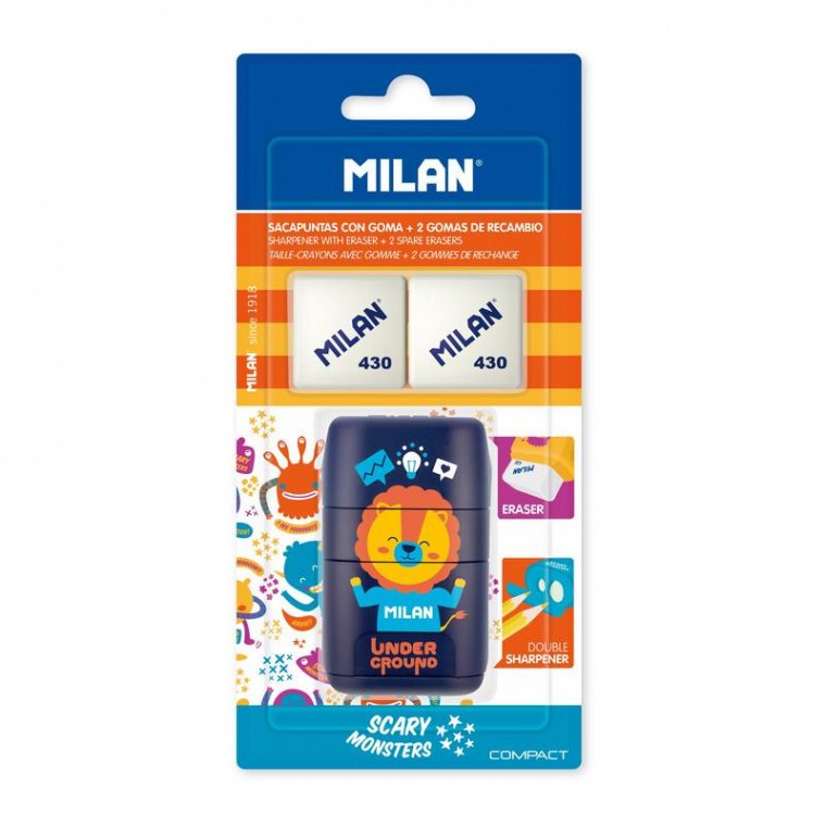 Ластик-точилка для карандашей с двумя запасными ластиками. Точилка для стандартных и утолщенных Maxi карандашей. Точилка имеет острое и прочное лезвие из углеродистой стали, систему безопасных лезвий, которая предотвращает отсоединение лезвия от корпуса точилки. Идеально для школьного использования. Ластики из синтетического каучука, идеально стирают чернографитный карандаш со всех типов бумаги.