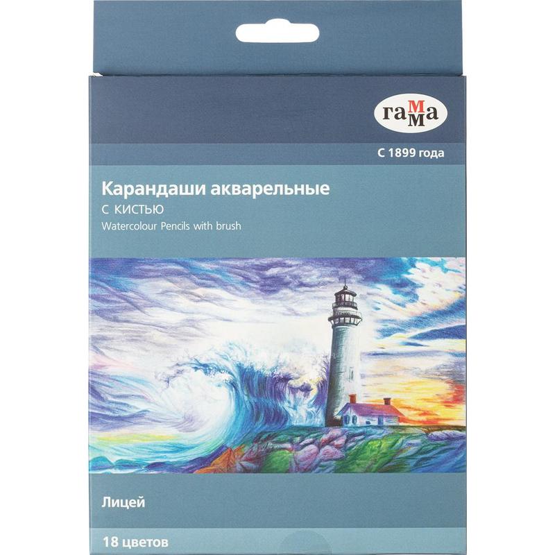 Карандаши цветные акварельные Гамма Лицей 18 цветов шестигранные с кистью для школьников и начинающих художников. Водорастворимый пигмент в составе грифеля позволяет получить эффект акварели при размывании кистью. Карандаши классической шестигранной формы, корпус из древесины специальной обработки с матовым покрытием, диаметр грифеля - 2,9 мм. Уникальная упаковка с выдвижным пеналом, в комплекте кисть ГАММА пони круглая №4. Карандаши удобно брать с собой для быстрых зарисовок. Работу можно корректировать ластиком-клячкой на этапе рисования сухим способом. Чтобы проработать детали, грифель легко заточить точилкой, ножом или наждаком. Большой выбор цветов и оттенков. Три способа рисования: сухой - как обычными карандашами; мокрый - рисование на влажной бумаге или с последующим размыванием; альтернативный - набор пигмента на влажную кисть для эффекта акварельных красок.