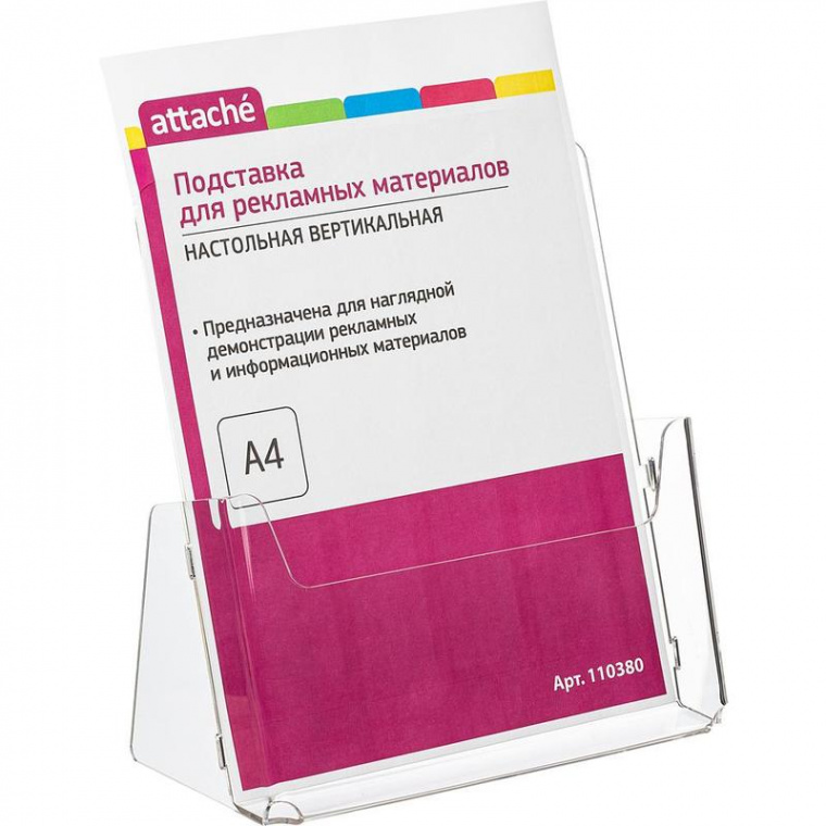 Вертикальная односторонняя настольная подставка Attache формата А4. Поставляется в индивидуальной защитной пленке. Вмещает стопку информационных материалов толщиной до 32 мм. Имеет низкий борт для легкого излечения брошюр или листовок. Материал — бесцветное прозрачное акриловое оргсекло. В упаковке 4 подставки. Размеры изделия (ВxШxГ): 230×215×32 мм.