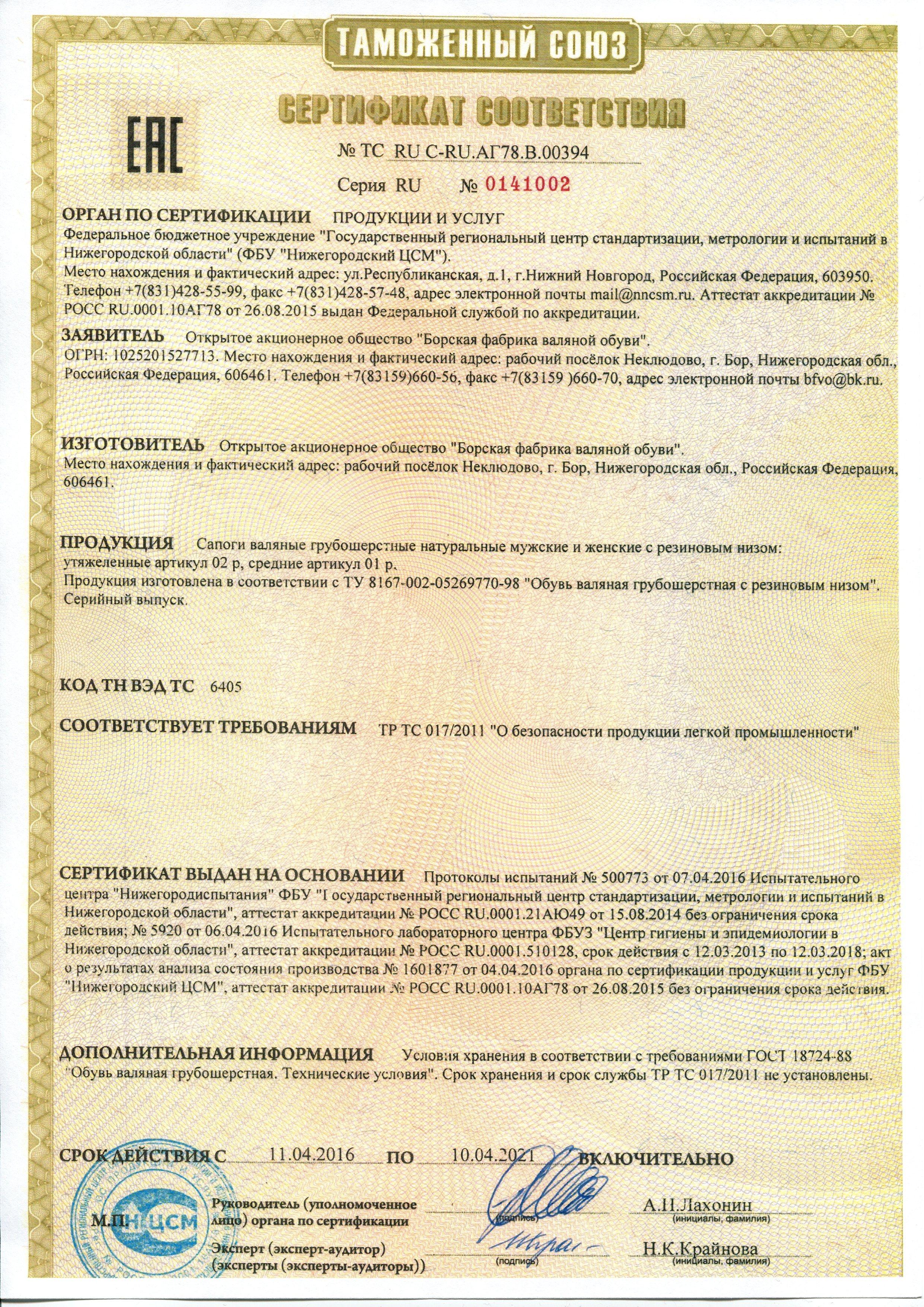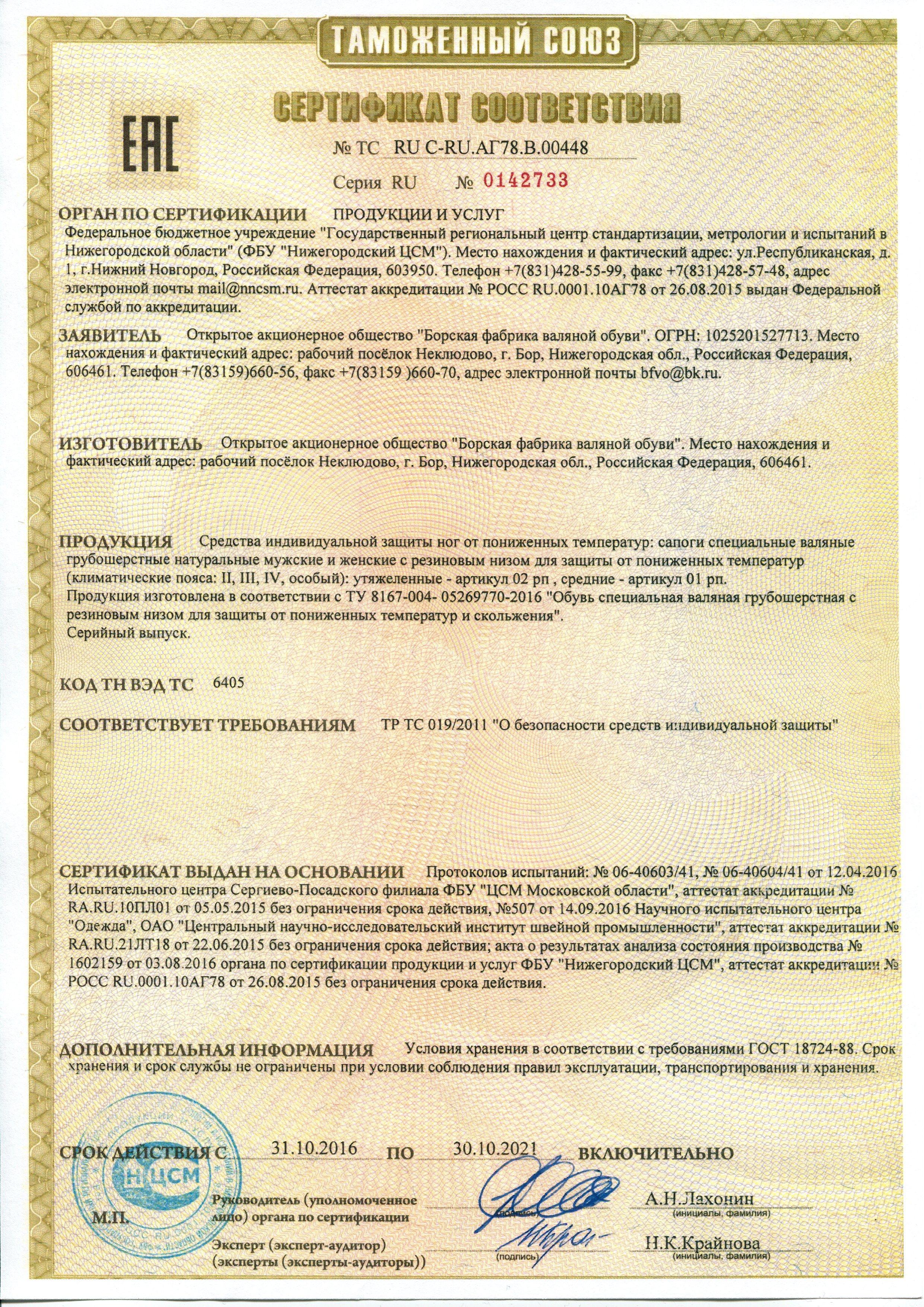Сертификат на товар - Валенки 100% шерсть на резиновой подошве серые размер 45