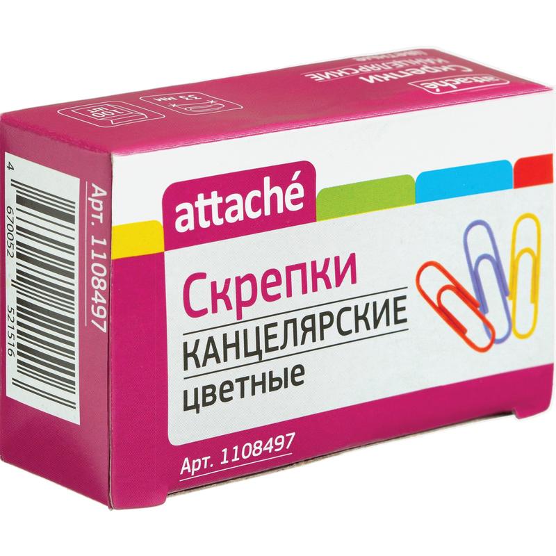 Скрепки Attache незаменимы при работе в офисе или дома, когда нужно соединить несколько бумаг, например, все листы договора или другие важные документы. Металлические с цветным покрытием из пластикового полимера. Имеют закругленную форму, что позволяет надежно скреплять документы. Разноцветные. Длина 33 мм. В упаковке 100 скрепок. В промежуточной упаковке 10 упаковок по 100 скрепок.