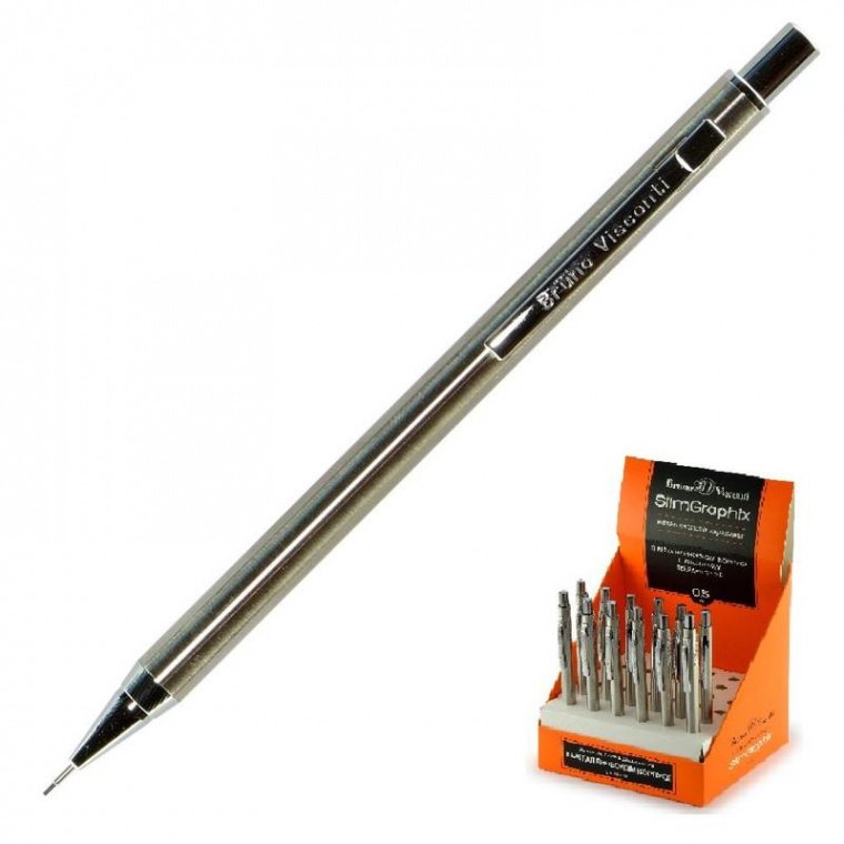 Карандаш механический Bruno Visconti Slimgraphix с толщиной линии письма 0,5 мм. Выполнен в металлическом корпусе с клипом. Карандаш механический оснащен ластиком, который находится под металлическим клипом. В карандаше уже есть стержень длиной 60 мм, жесткость — 2B. Длина карандаша 140 мм. Диаметр корпуса 8 мм. Форма корпуса — круглая. Производство: Китай.
