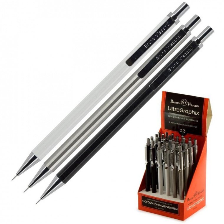 Карандаш механический Bruno Visconti UltraGraphix с толщиной линии письма 0,3 мм. Степень жесткости — HB. Корпус круглой формы выполнен из высококачественного металла. Карандаш механический оснащен ластиком. Производство: Китай. Заказать расходные материалы (или комплектующие) к этому товару вы можете через менеджеров нашего