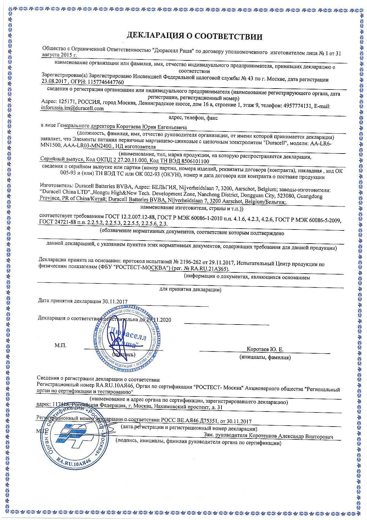 Сертификат на товар - Батарейки Duracell Basic мизинчиковые ААA LR03 (4 штуки в упаковке)