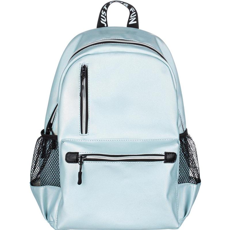 Одно основное отделение на молнии. На лицевой стороне имеется накладной карман на молнии и дополнительный вертикальный карман на молнии. Два боковых кармана с сеткой. Внутри рюкзак отделан подкладочной тканью и имеет открытый внутренний карман. Мягкая уплотненная спинка, уплотненные задние лямки. Сверху ручка-петелька для ношения в руке. Особенности: материал рюкзака - перламутровая экокожа.