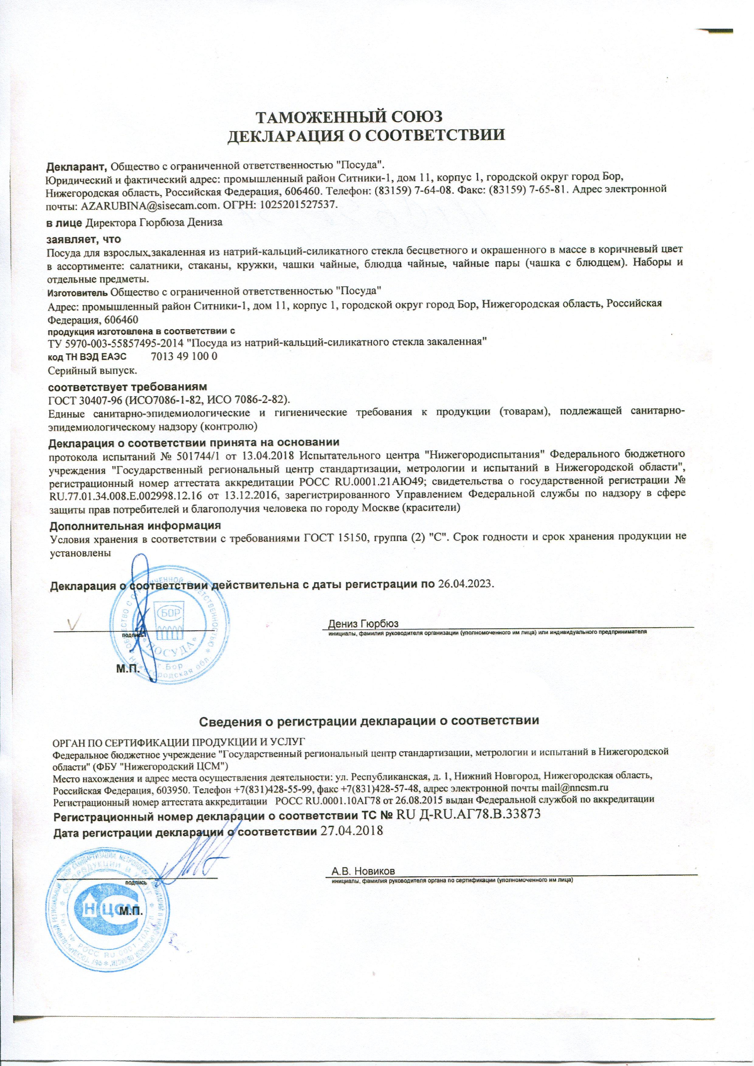 Сертификат на товар - Стакан Pasabahce Касабланка стеклянный 265 мл (артикул производителя 52705SLBT)