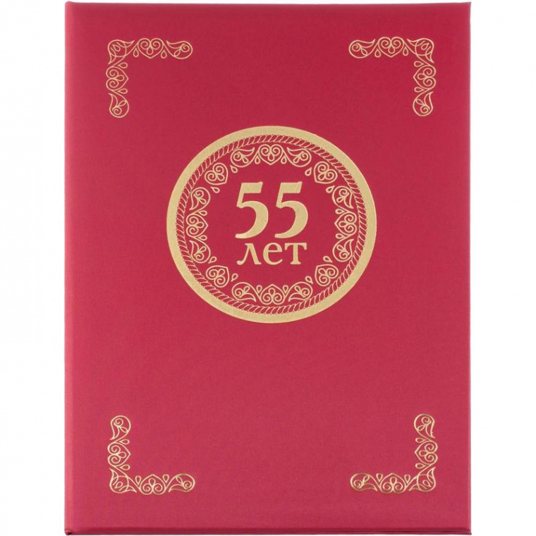 Адресная папка формата А4. Папка выполнена из переплетного материала танго бордового цвета (слой ПВХ на бумажной основе). Внутренние вклейки — из балакрона (ПВХ с имитацией кожи). На обложке надпись «55 лет» и орнамент (тиснение золотой фольгой). Внутрь вложен бланк с праздничным оформлением для написания текста поздравления (со сгибом посередине), есть фиксирующий ремешок. Ручная сборка. На папку можно нанести логотип. Подходит для поздравлений, торжественного мероприятия.