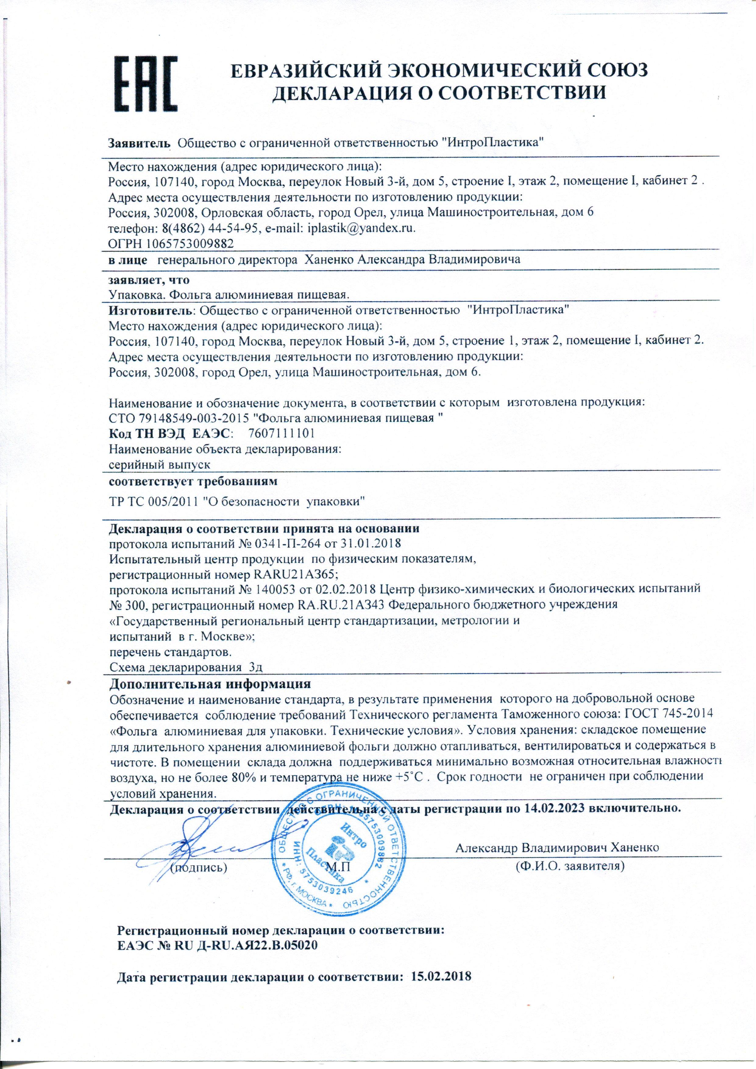 Сертификат на товар - Фольга пищевая алюминиевая Комус 9 мкм x 290 мм x 100 м