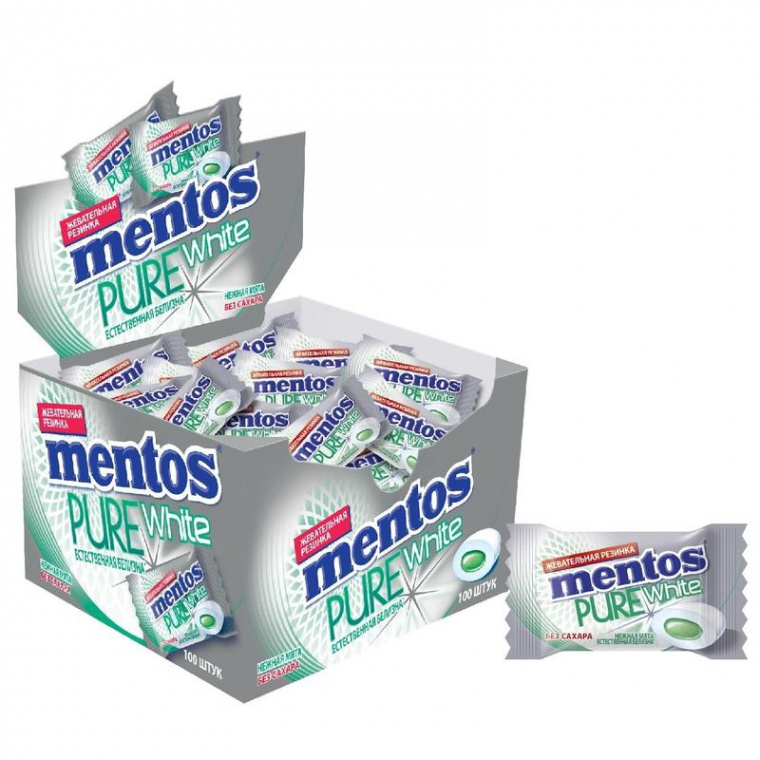 Жевательная резинка Mentos Pure White нежная мята 200 г (100 штук в упаковке). Уникальная круглая форма. Жидкий центр. Невероятное освежение и поддержание естественной белизны зубов.
