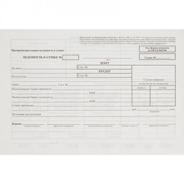 Бухгалтерские бланки — препроводительная ведомость денежной наличности. Сопровождают инкассаторские операции, фиксируют передачу денег в банк. Бланки отпечатаны на офсетной бумаге формата А5. В комплекте 99 штук, склеенных в виде книжки. Упакованы в термоусадочную пленку.