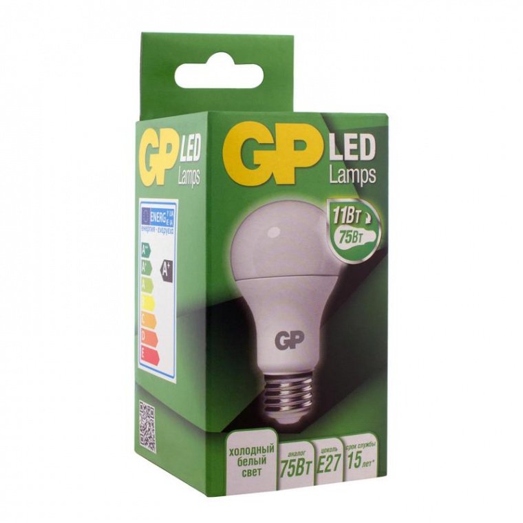 Светодиодная лампа GP — источник основного или локального освещения в помещении. Также используется для светильников, ночников, подходит для декорирования и создания световых зон. Низкое энергопотребление, срок службы и безопасность — главные преимущества светодиодных ламп. Лампа имеет классическую грушевидную форму и подходит к любым осветительным приборам, оснащенным цоколем Е27. Благодаря встроенной защите лампа не чувствительна к перепадам напряжения (рабочий диапазон — 220-240В). Свет холодный белый, без мерцания. Лампа создает мягкое естественное освещение, оптимальное для жилых помещений. Благодаря низкому уровню энергопотребления светодиодные лампы экономичнее классических ламп накаливания. Так, лампа мощностью 11Вт по уровню свечения эквивалентна обычной лампочке в 75 Вт. Срок службы составляет 15 лет при среднем использовании прибора по 3 часа в сутки. Использование ламп в домашних условиях соответствует правилам и нормам безопасности. Лампа не нагревается в процессе работы и выдерживает многократные выключения без потери яркости.