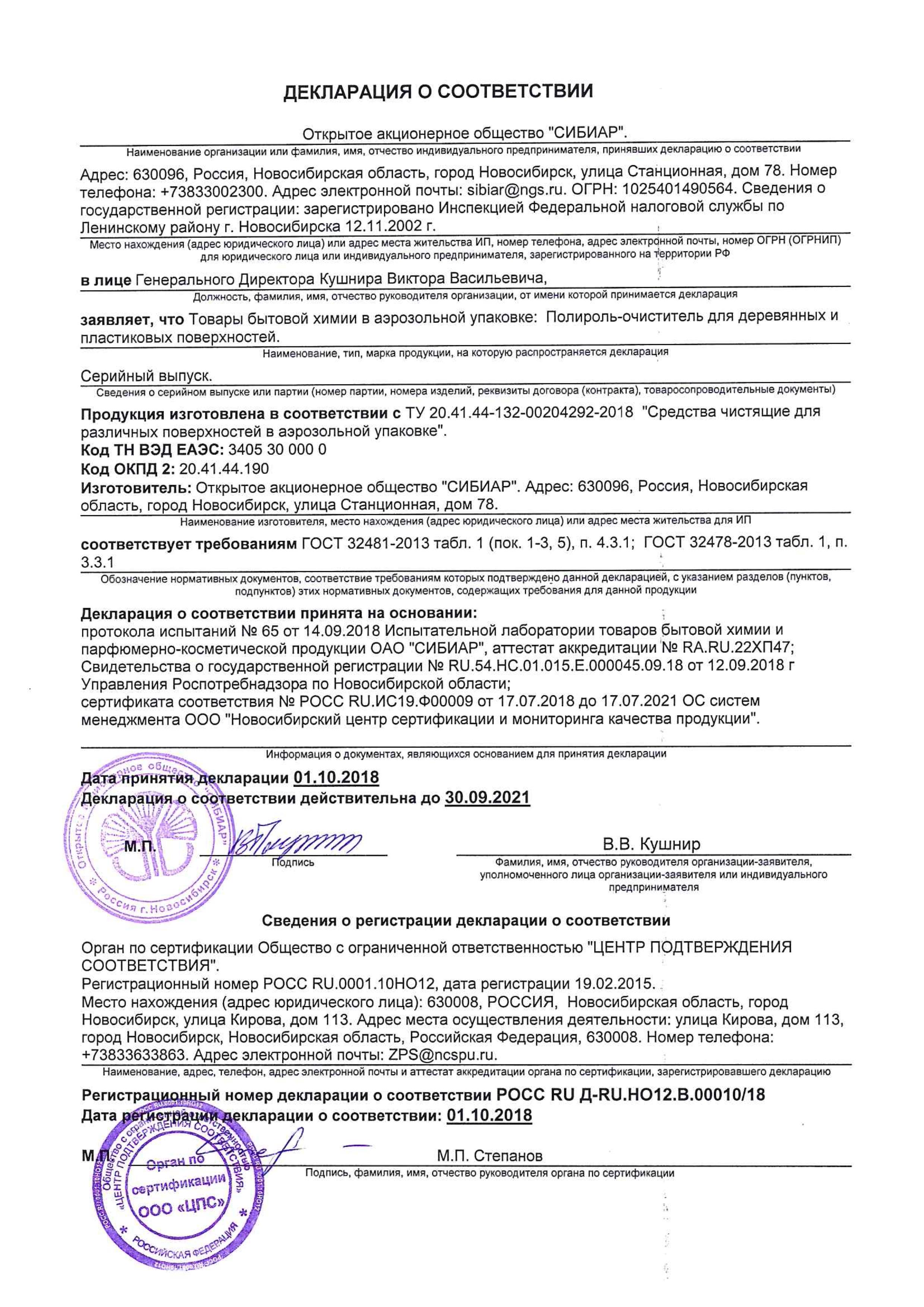 Сертификат на товар - Полироль для мебели Весенняя свежесть 300 мл