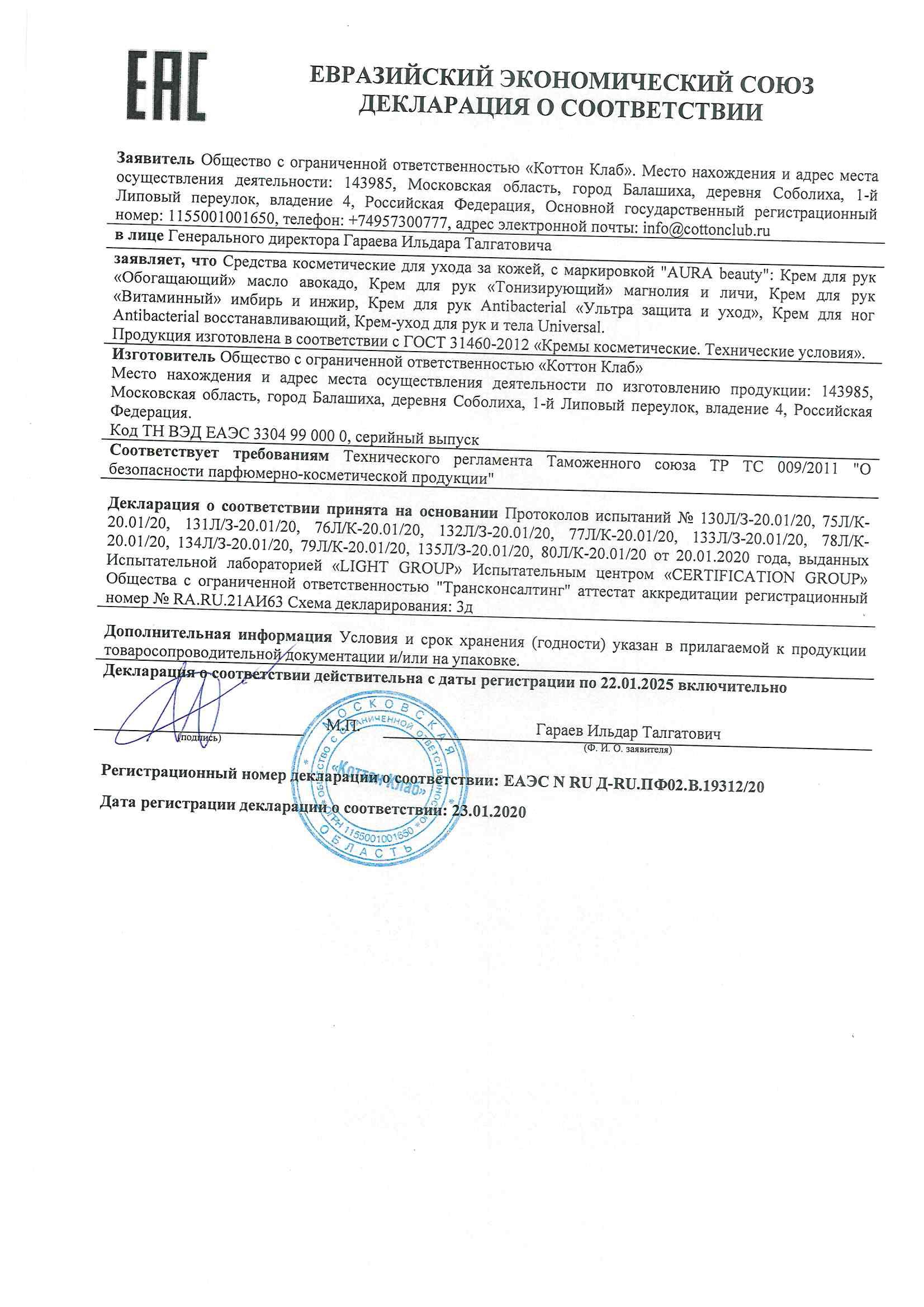 Сертификат на товар - Крем для рук Aura Beauty Your Richness обогащающий 75 мл