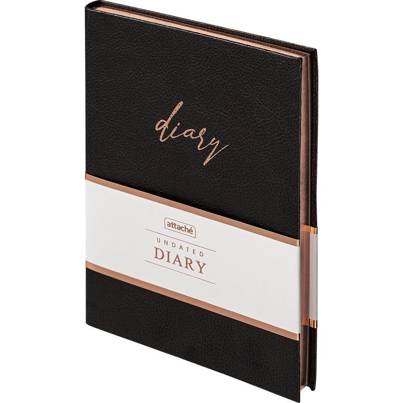 Ежедневник недатированный Attache, черный. Формат - А5, размер изделия#140x200 мм. Однотонная мягкая обложка из искусственной кожи. Материал фактурный. Возможно нанесение логотипа на обложку, любым способом тиснения (блинт, фольга). Срез: золотистый (розовое золото). Блок: недатированный, 136 листов (272 страницы), офсет 70 г/кв.м, в 1 краску (линейка), ляссе коричневого цвета. Форзац/нахзац: 180 г/кв.м, коричневого цвета. Содержит информационно-справочный блок - личные данные, календарь, карта часовых поясов, единицы измерения, международные форматы бумаги, телефонные коды крупных городов России, телефонные коды стран и городов мира, международные размеры одежды и обуви, знаки зодиака, питание и расход калорий, телефоны первой необходимости в Москве, автомобильные коды регионов России.