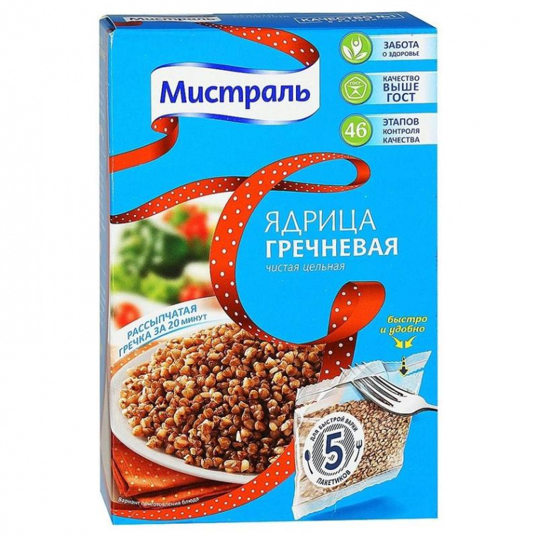 Гречка «Мистраль» ядрица чистая цельная в пакетиках 5×80 г. Быстроразваривающаяся (пропаренная). Высший сорт. Гречневая крупа «Мистраль» имеет однородный коричневый цвет, приятный яркий аромат и неповторимый вкус.