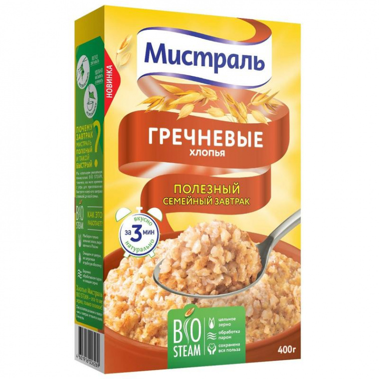 Хлопья «Мистраль» — это полезный завтрак, энергия и чувство сытости надолго. Полезные сложные углеводы и ценная клетчатка способствуют улучшению пищеварения. Витамины и микроэлементы заряжают бодростью на целый день. Хлопья «Мистраль» Bio Steam — это то же зерно, только плоское! Оно остается цельным и полезным, а завтрак готовится всего 3 минуты.